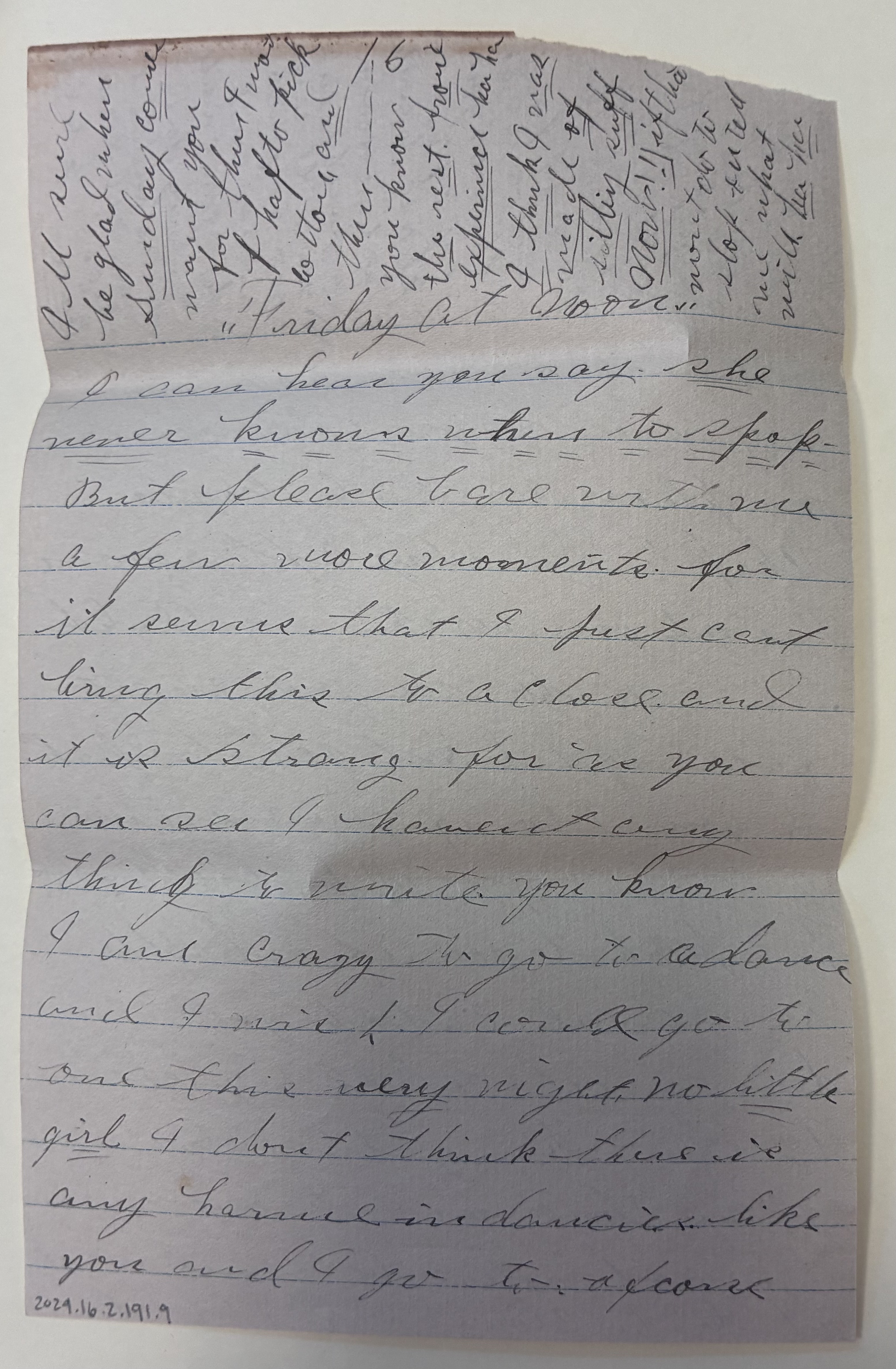 "Friday at noon" I can hear you say she never knows when to spok But please bare with me a few more moments for it seems that I just cant bring this to a close and it is strang for as you can see I haven't any thing to write you know I and I will I could go to one this very night no little girl I dont think there is any harme in dancing like you and I go to a dance