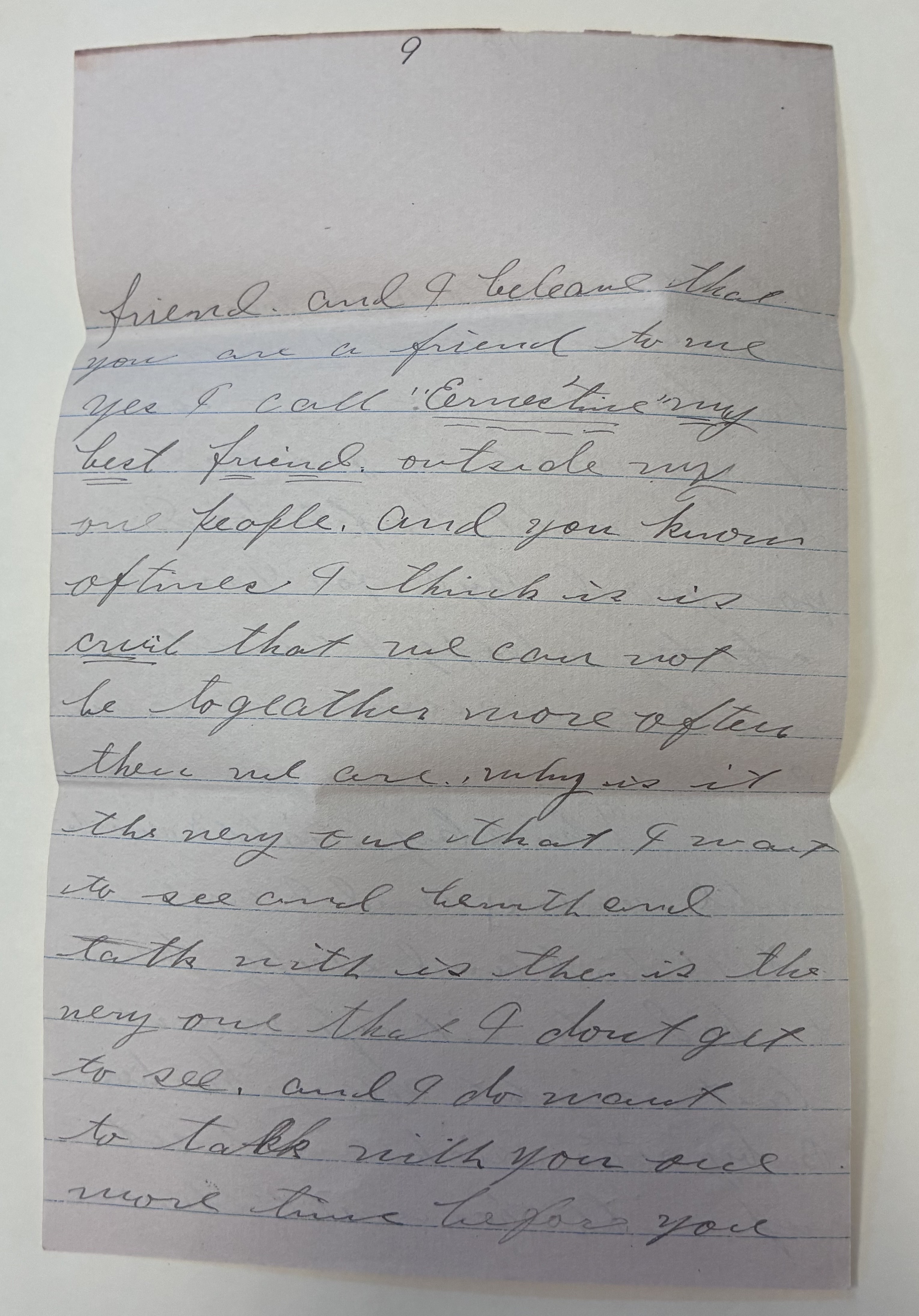 friend and I [illegible] that you are a friend to me yes I call "Ernestine" my best friend out sole my one people and you know of times I think is in cruel that we can not be together more often there we are why is it the very one that I want to see and [illegible] and talk with is tho is the very one that I dont get to see and i do want to talk with you one more time before you