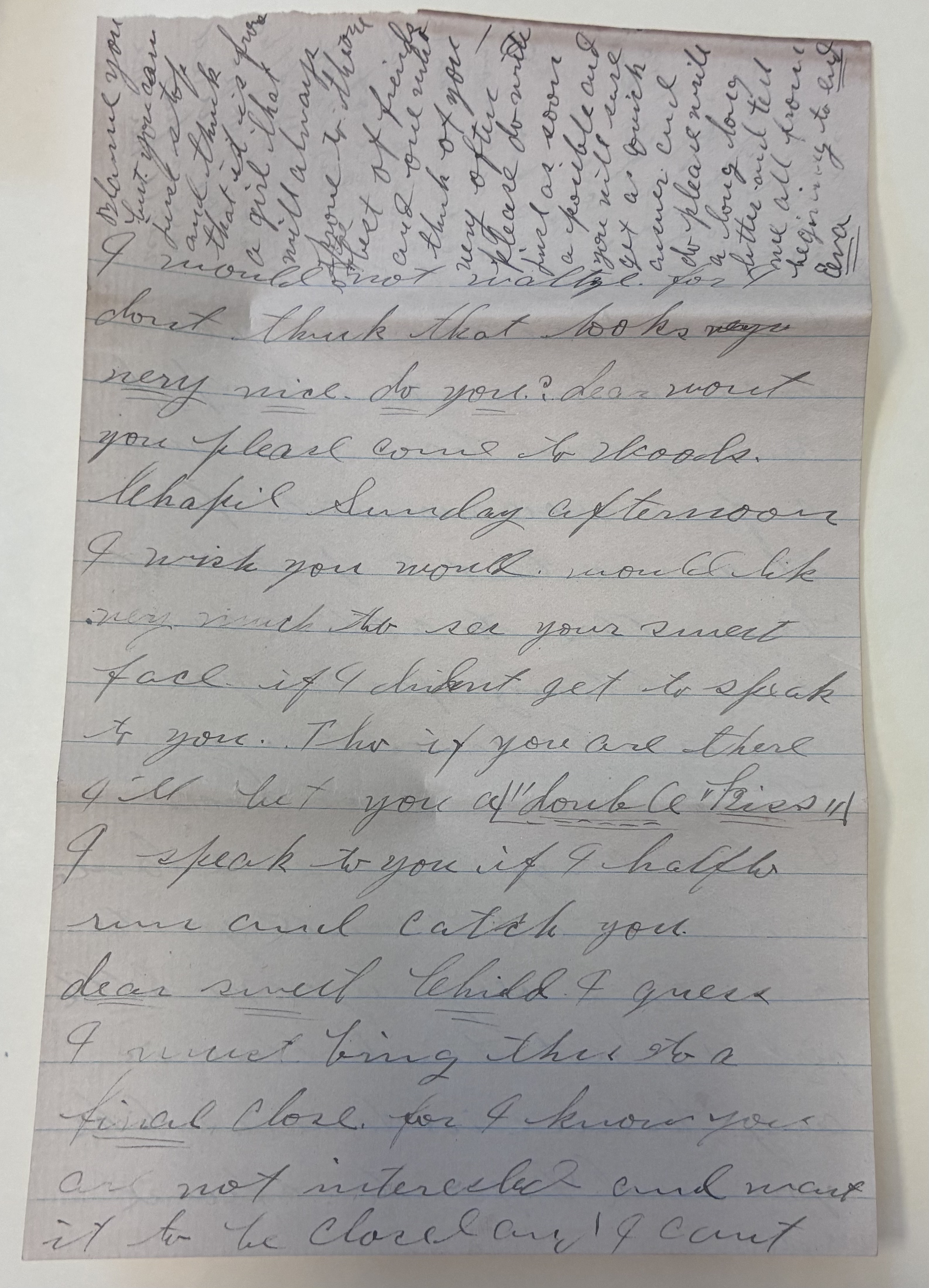 I would not [illegible] for dont think that looks veys [veys struck out] very nice do you? dear wont you please come to Woods Chapel Sunday afternoon I wish you would would like very much to see your sweet face if I didn't get to speak to you. Tho if you are there I'll bet you a "double" kiss" I speak to you if I half be sure and catch you dear sweet Child I guess I must bring this to a final close for I know you and not interested and wont it to be closed one ! I cant [continued on the top space of the back of 191.7]