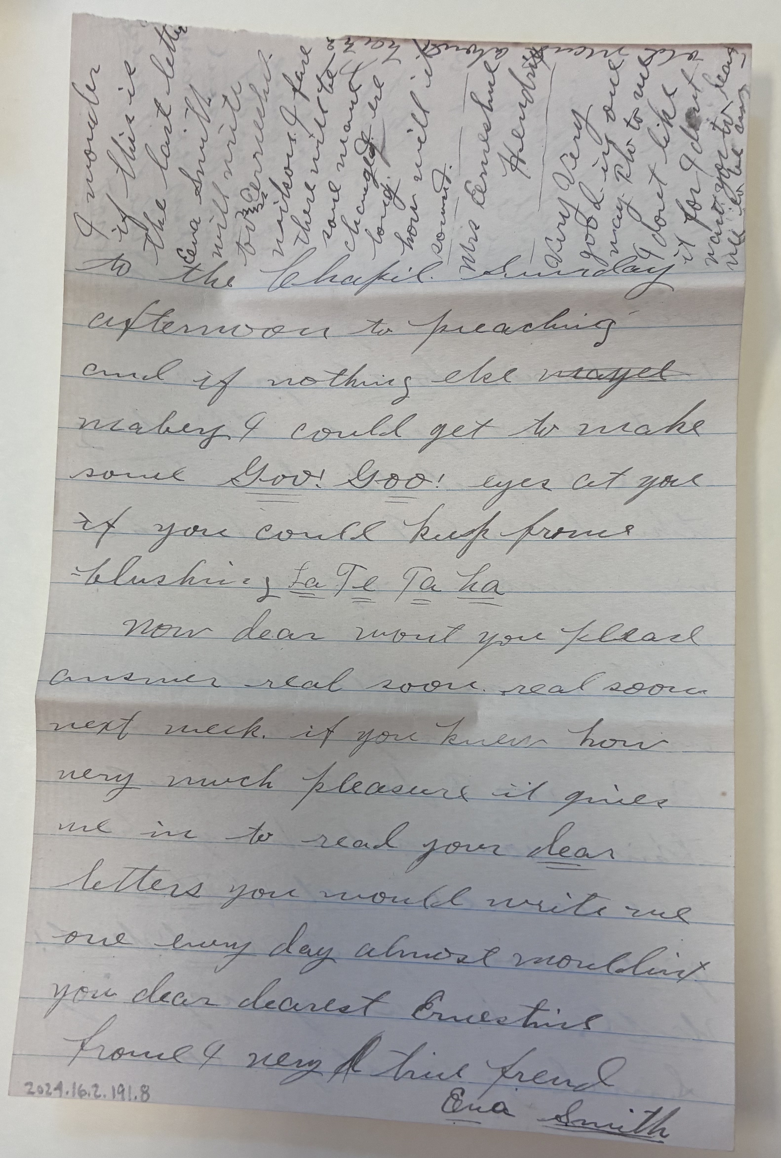 Now dear wont you please answer real soon real soon next week if you knew how very much pleasure it gives me in to read your dear letters you would write me one every day almost [illegible] you dear dearest Ernestine home I very d [d struck out] thiss frend Eva Smith