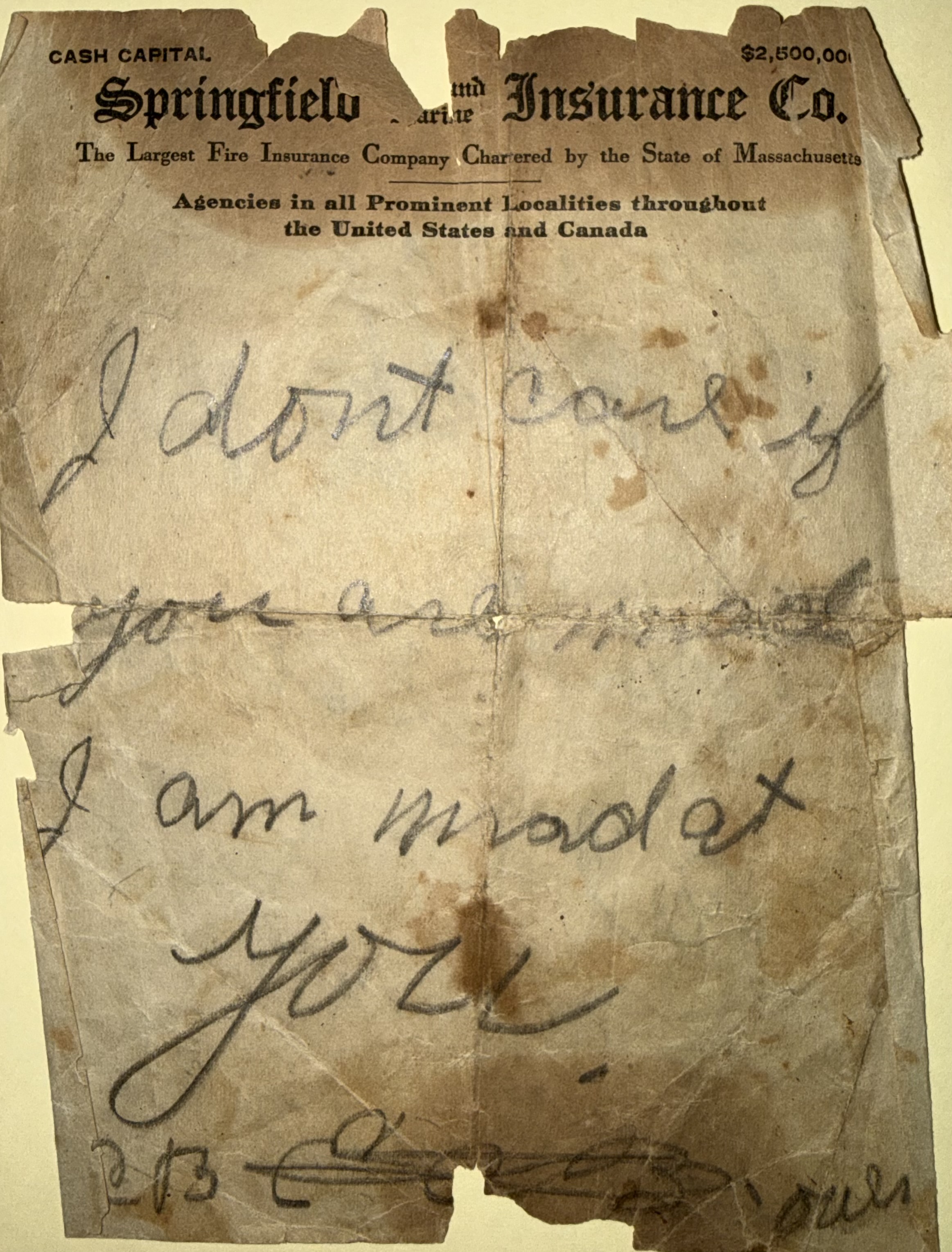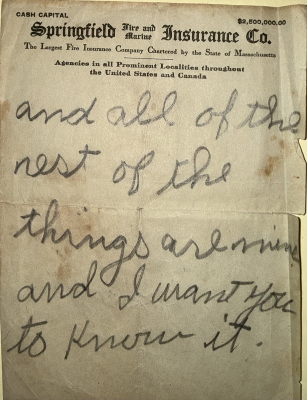 The note reads "Alfred that se saw that you got is half mine. I fixed as much of it as you did" (2026.23.4), "and all of the rest of the things are mine and I want you to know it" (2026.23.5), "I don't care if you are mad. I am mad at you. I help fix that sand pile, ECB" (2026.23.6). - Format