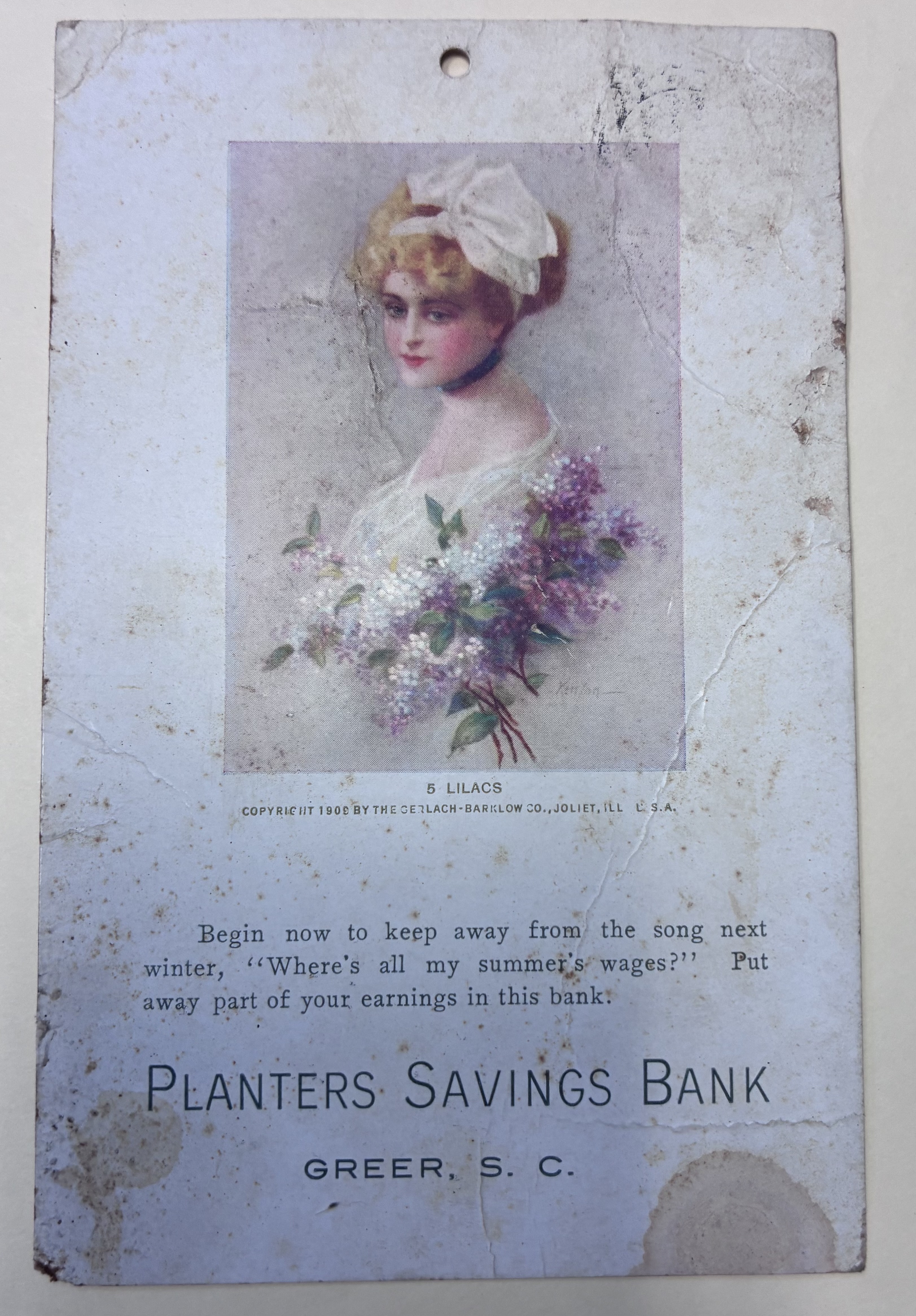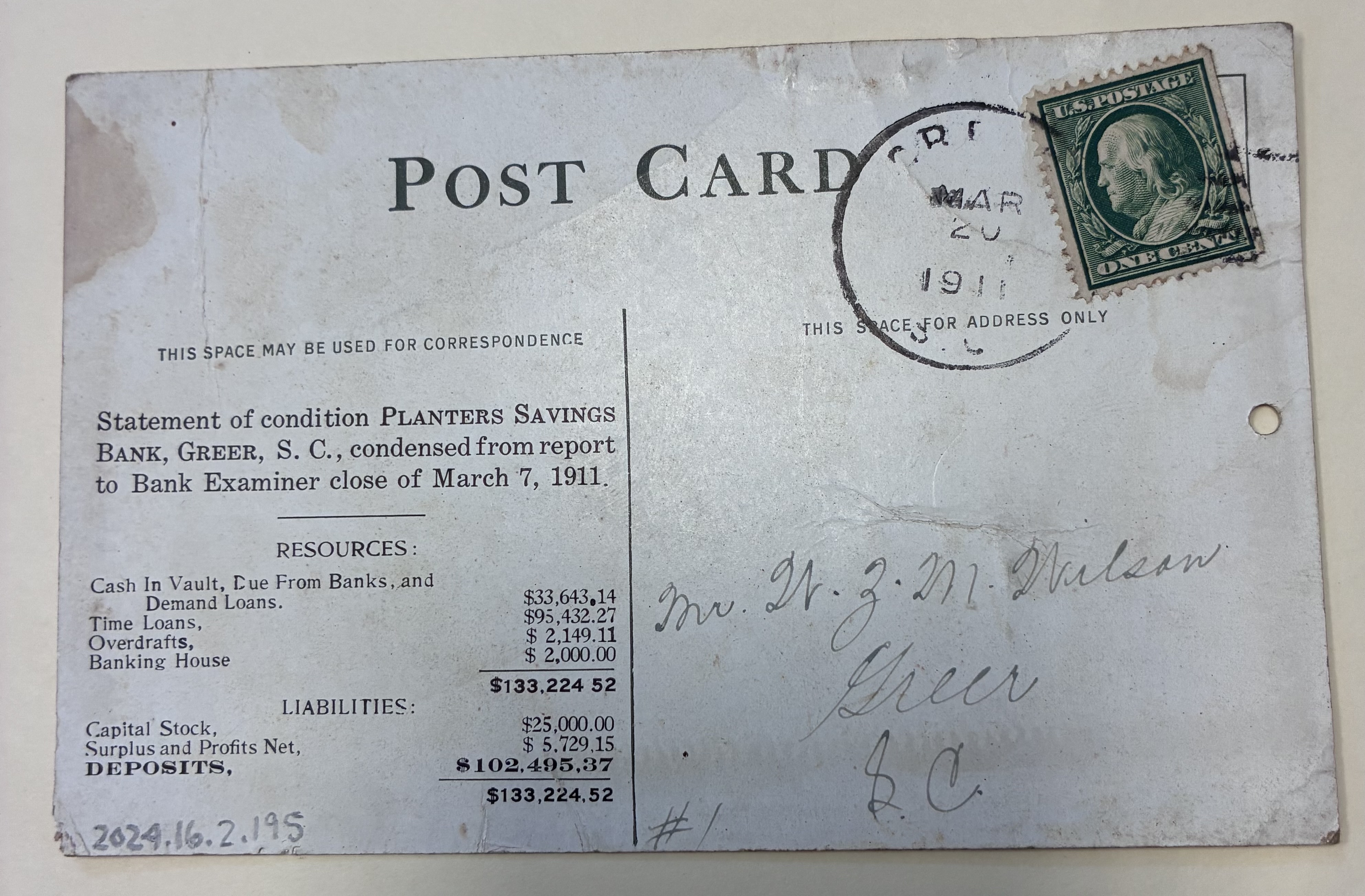 - Planters Savings Bank Postcard, Greer, S.C., March 20, 1911