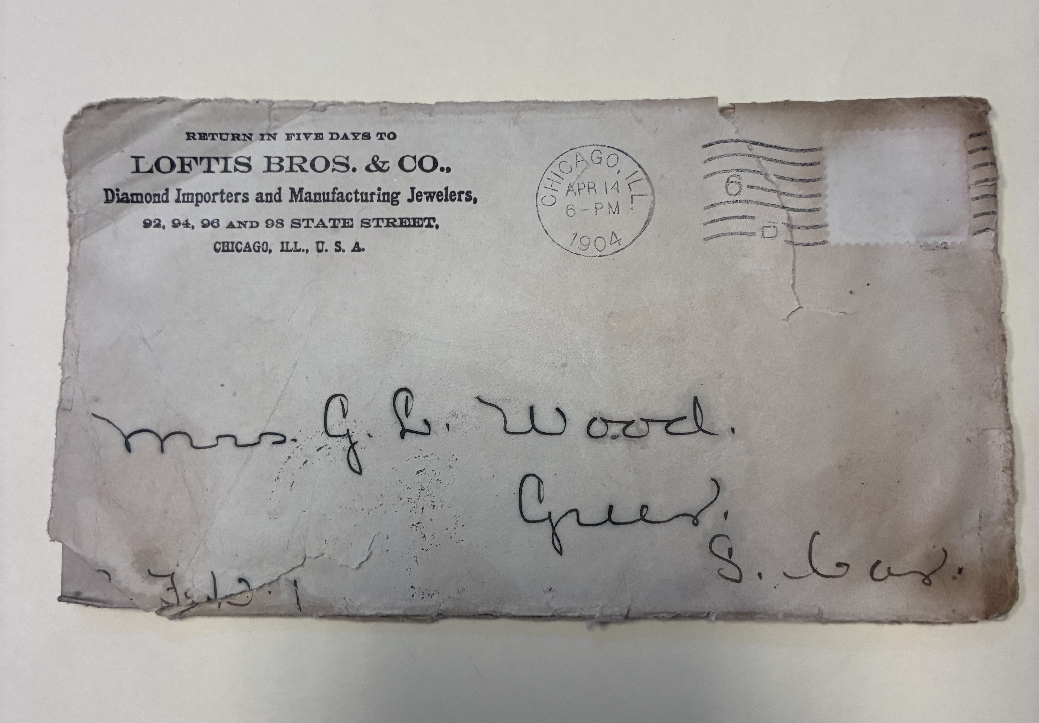 199.1 Envelope from Loftis Bros. & Co., Diamond Importers and Manufacturing Jewelers, Chicago, Ill., to Mrs. G.L. Wood, Greer, S.C.
