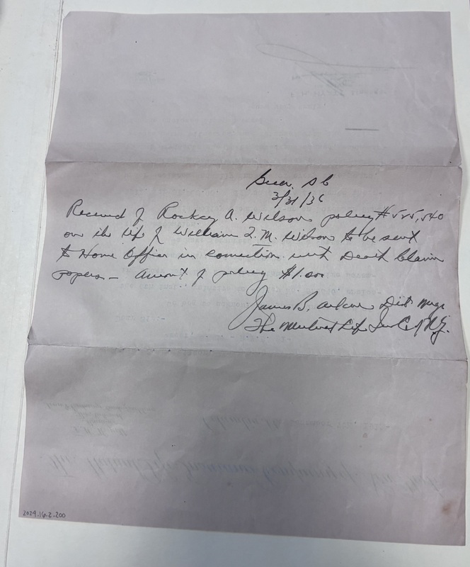 Note on the back of Roxie A. Wilson receiving W.Z.M. Wilson's life insurance policy