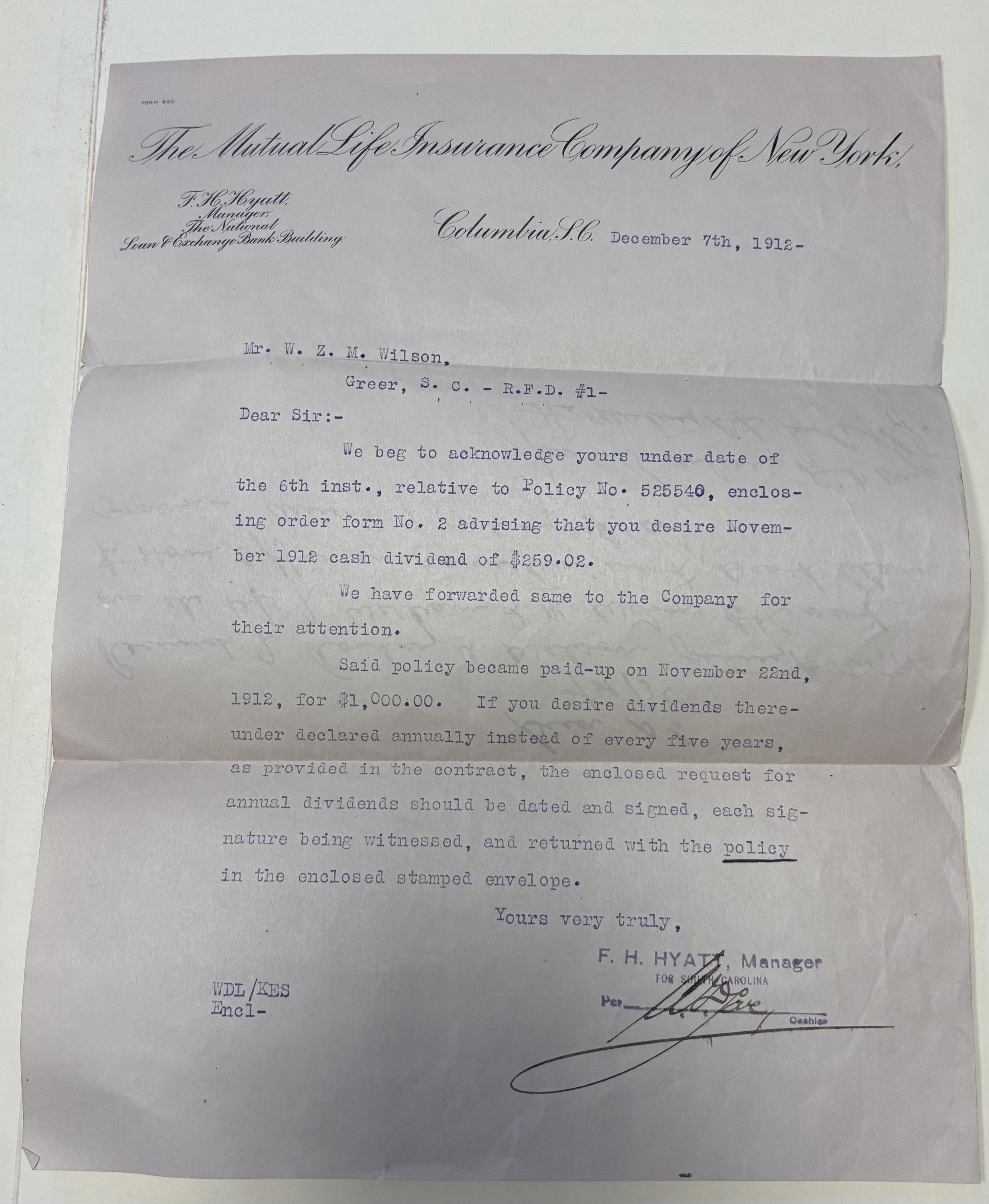 Dividends letter from The Mutual Life Insurance Company of New York, Columbia, S.C., to Mr. W.Z.M. Wilson, Greer, S.C.