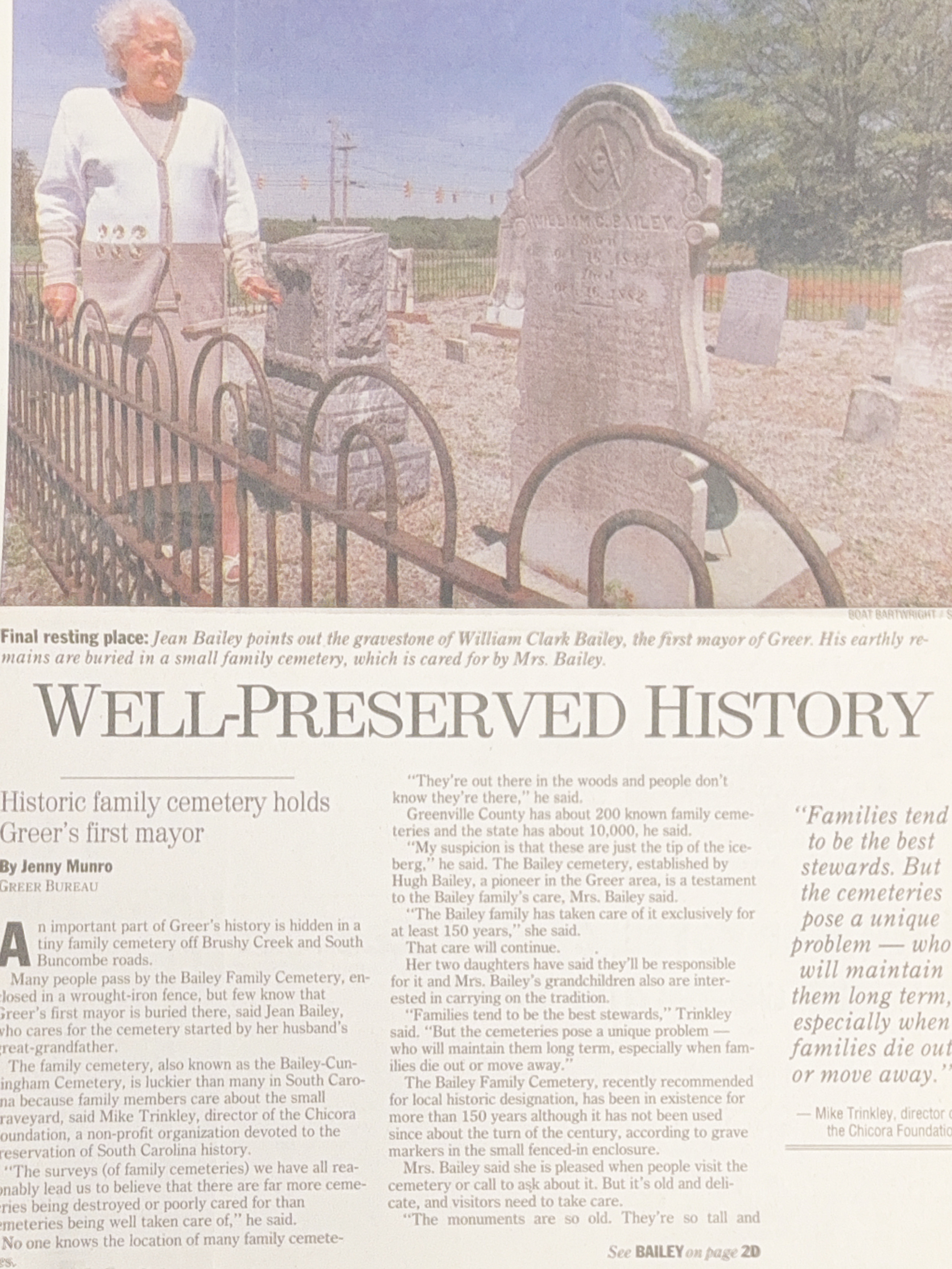 My suspicion is that these are just the tip of the iceberg,” he said. The Bailey cemetery, established by Hugh Bailey, a pioneer in the Greer area, is a testament to the Bailey family’s care, Mrs. Bailey said.