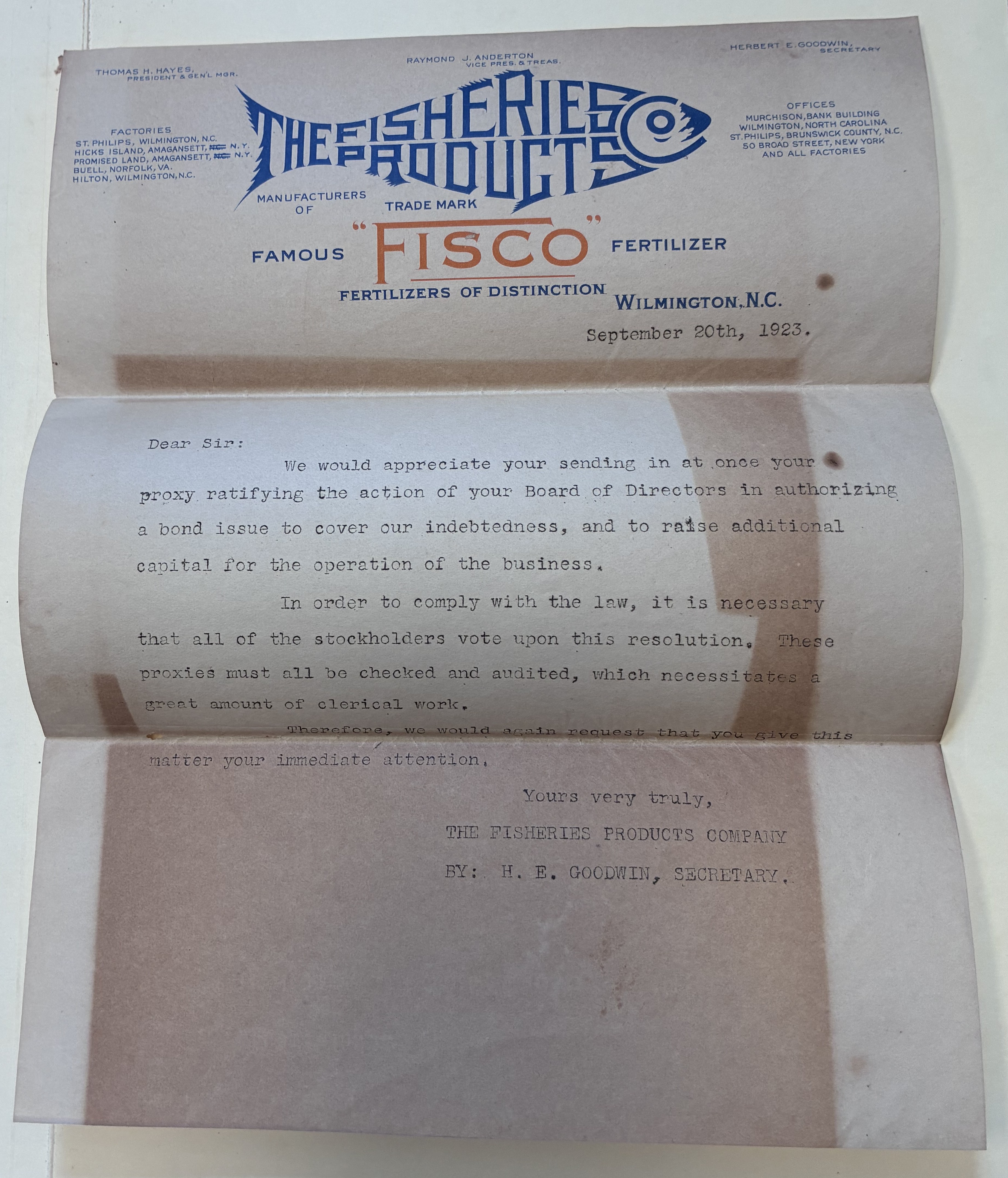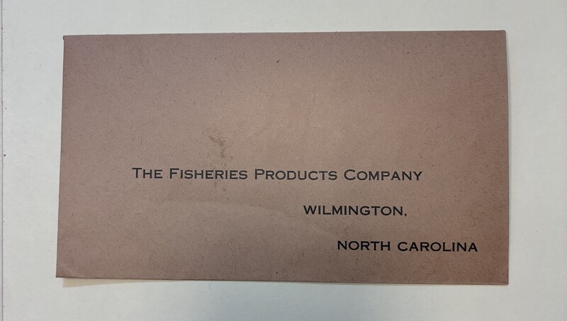 - The Fisheries Products Company Envelope and Letters, Wilmington, N.C., 1923