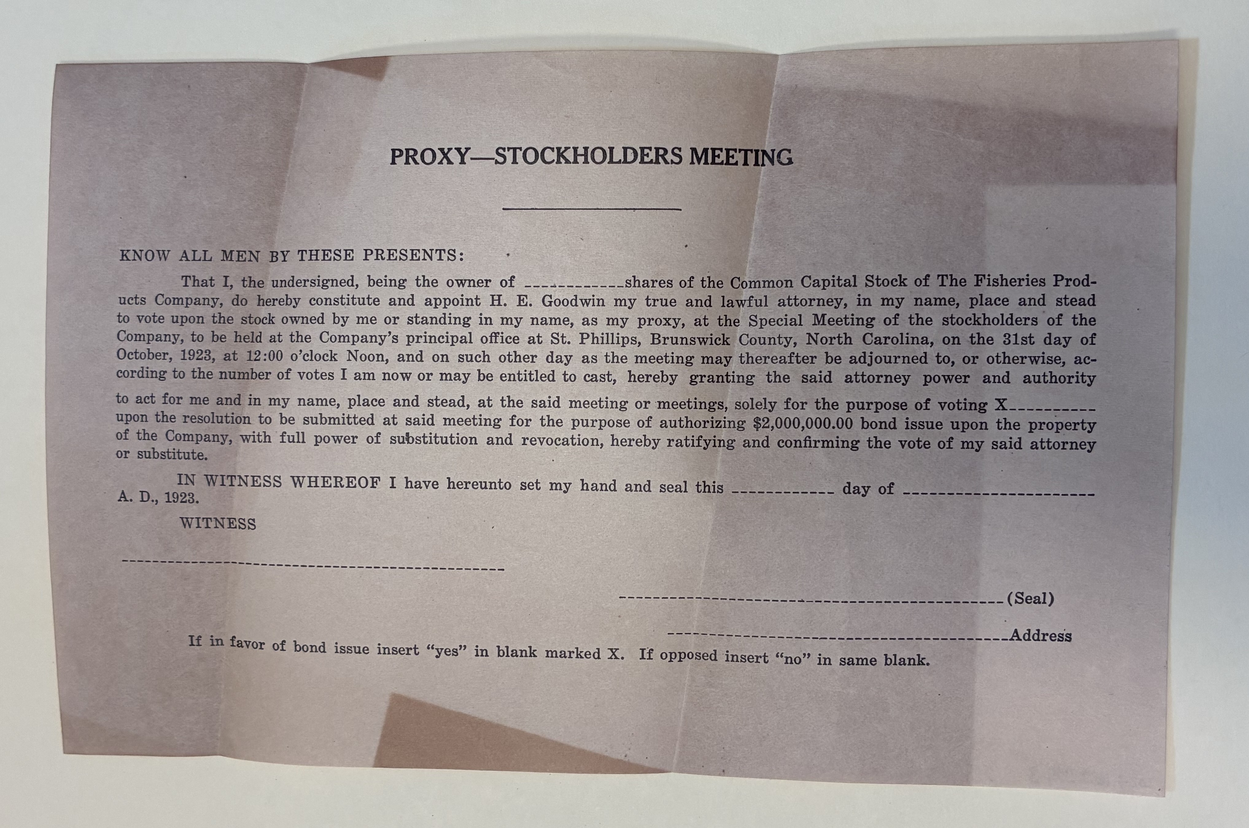 That I, the undersigned, being the owner of _ _ _ _ _ _ _ _ _ _ _ _ shares of the Common Capital Stock of The Fisheries Prod-ucts Company, do hereby constitute and appoint H. E. Goodwin my true and lawful attorney, in my name, place and stead to vote upon the stock owned by me or standing in my name, as my proxy, at the Special Meeting of the stockholders of the Company, to be held at the Company's principal office at St. Phillips, Brunswick County, North Carolina, on the 31st day of October, 1923, at 12:00 o'clock Noon, and on such other day as the meeting may thereafter be adjourned to, or otherwise, ac-cording to the number of votes I am now or may be entitled to cast, hereby granting the said attorney power and authority to act for me an in my name, place and stead, at the said meeting or meetings, solely for the purpose of voting X _ _ _ _ _ _ _ _ _ _ upon the resolution to be submitted at said meeting for the purpose of authorizing $2,000,000.00 bond issue upon the property of the Company, with full power of substitution and revocation, hereby ratifying and confirming the vote of my said attorney or substitute.