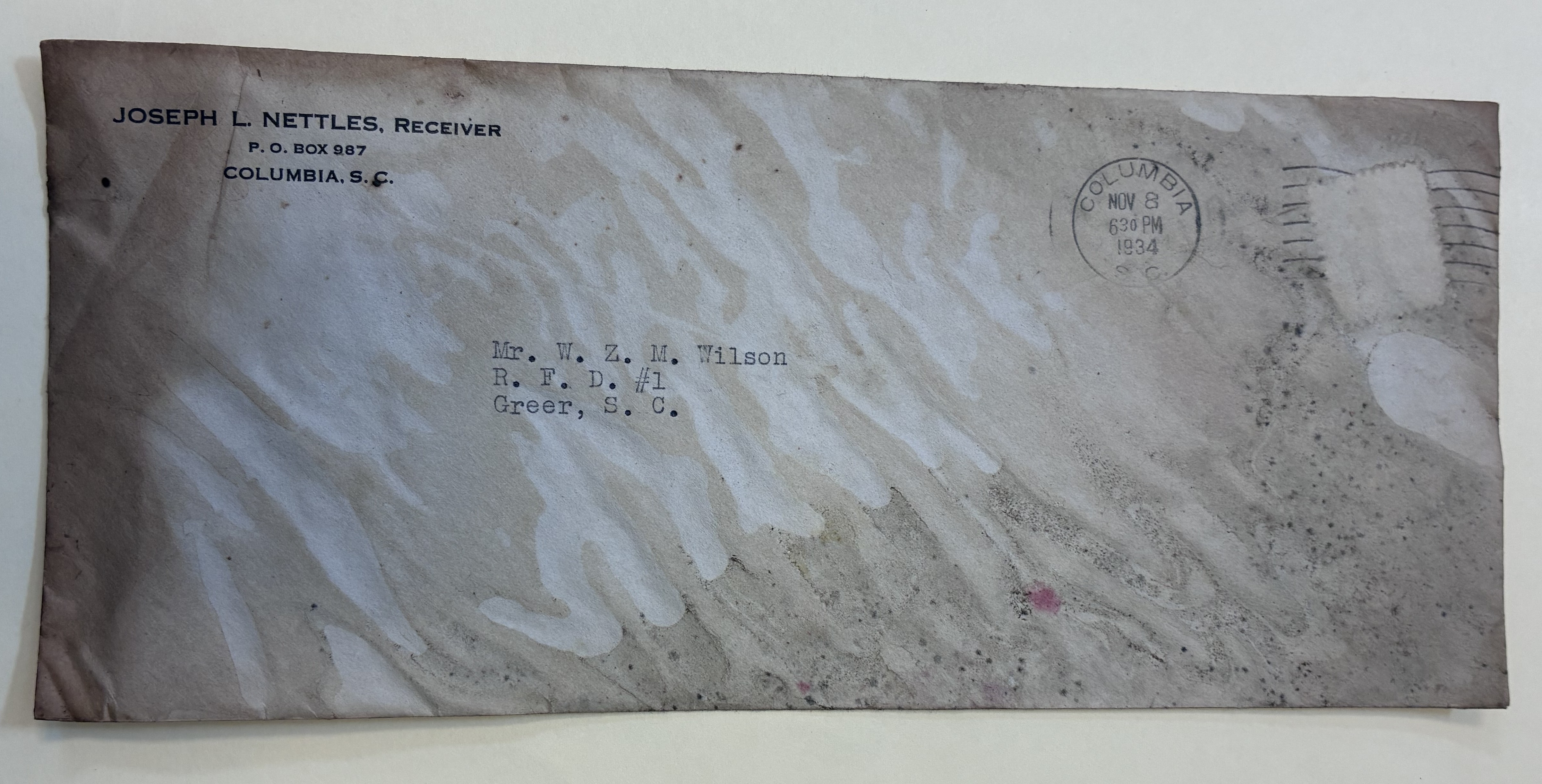 Envelope from Joseph L. Nettles, Receiver, Columbia, S.C., to Mr. W. Z. M. Wilson, Greer, S.C.
