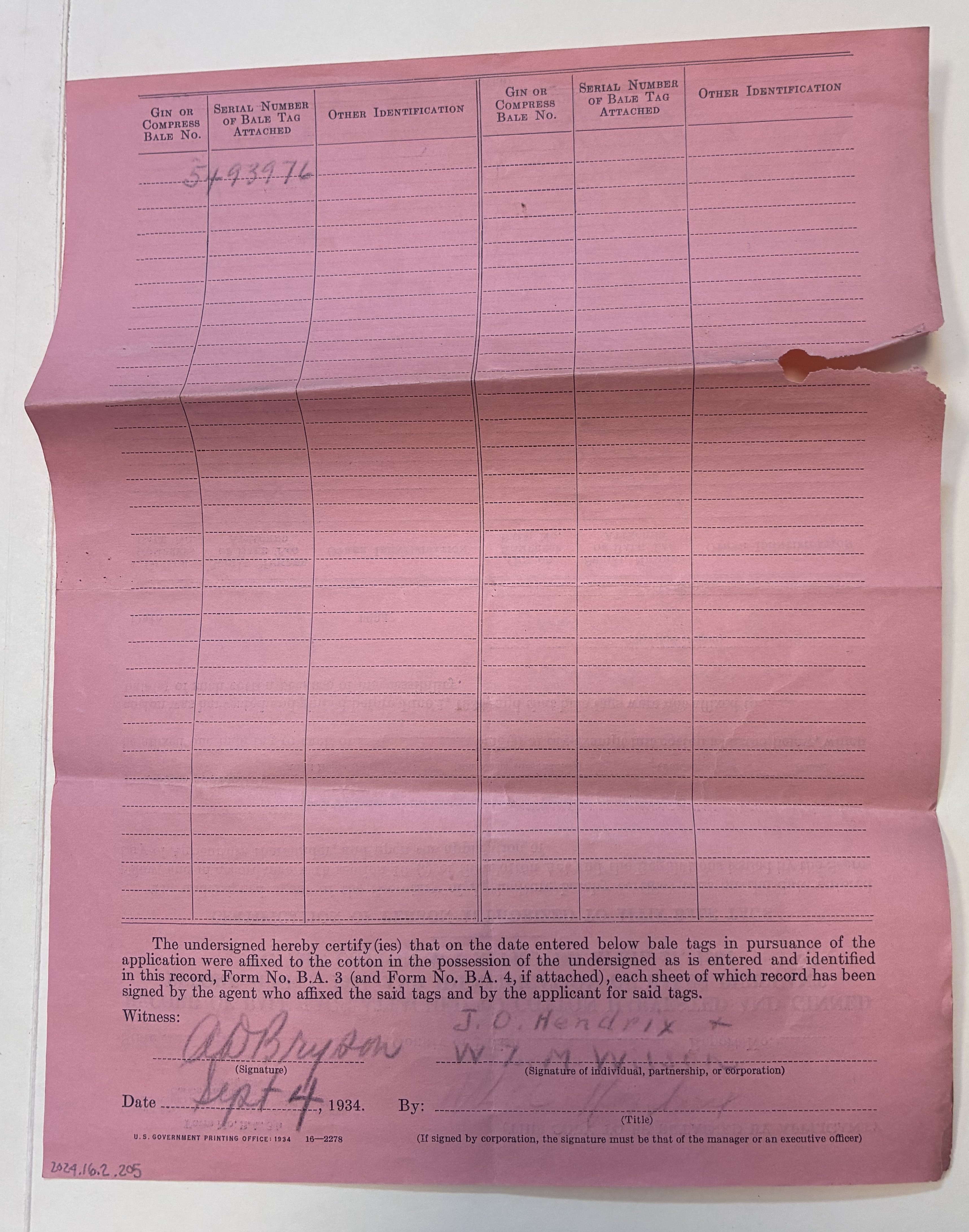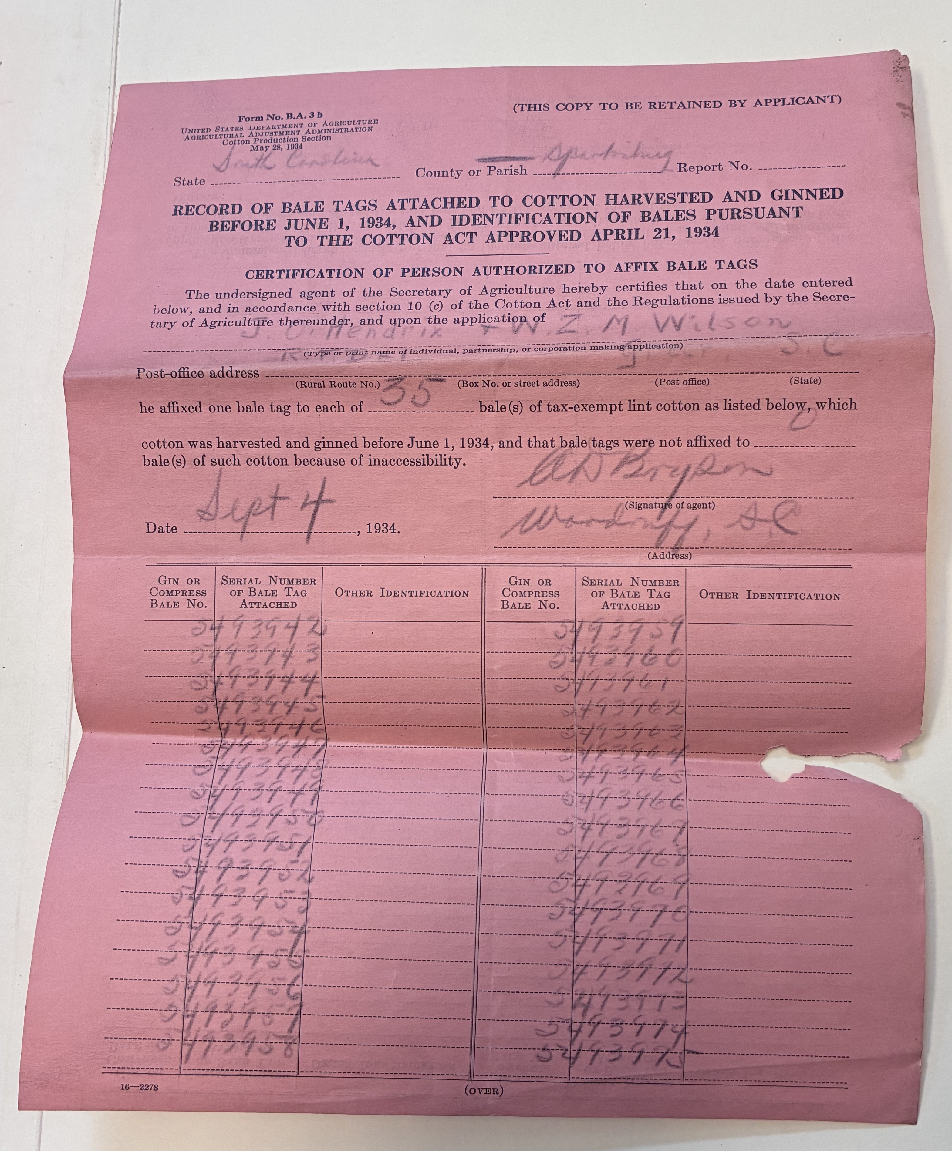 - Record of Bale Tags Form, Spartanburg, S.C., September 4, 1934