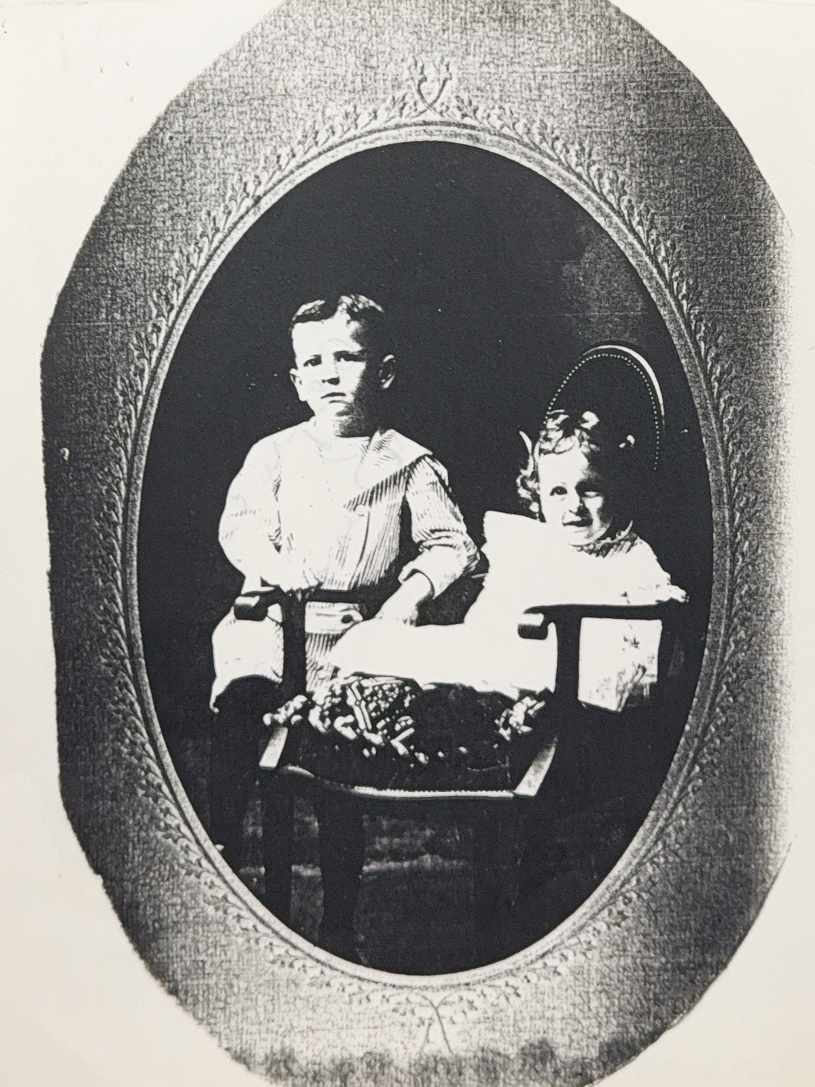 - Black and white photograph of two children. Written on the back: "Boy looks like Alfred Burgess with his sister."