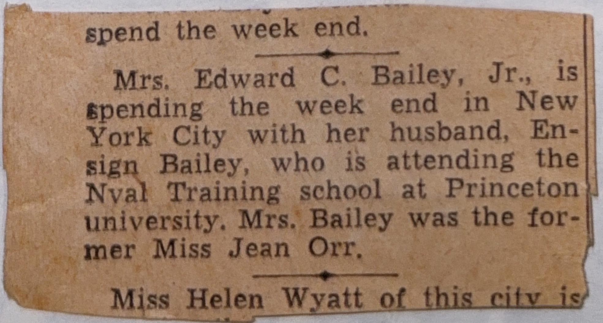 - Mrs. Edward C. Bailey, Jr., is spending the week end in New York City with her husband, Ensign Bailey, who is attending the Nval Training school at Princeton university. Mrs. Bailey was the former Miss Jean Orr.