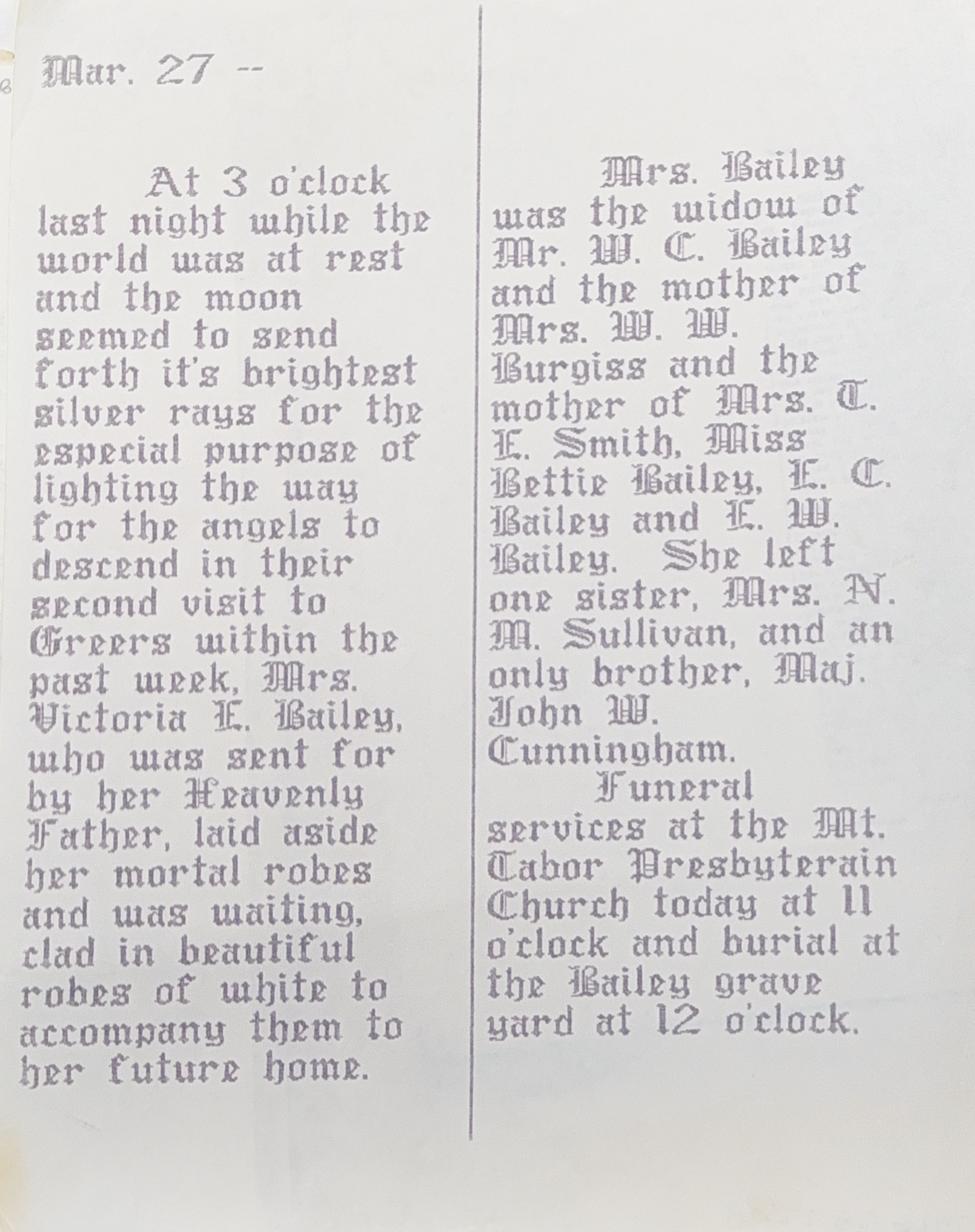 At 3 o’clock last night while the world was at rest and the moon seemed to send forth it’s brightest silver rays for the especial purpose of lighting the way for the angels to descend in their second visit to Greers within the past week, Mrs. Victoria E. Bailey, who was sent for by her Heavenly Father, laid aside her mortal robes and was waiting, clad in beautiful robes of white to accompany them to her future home.