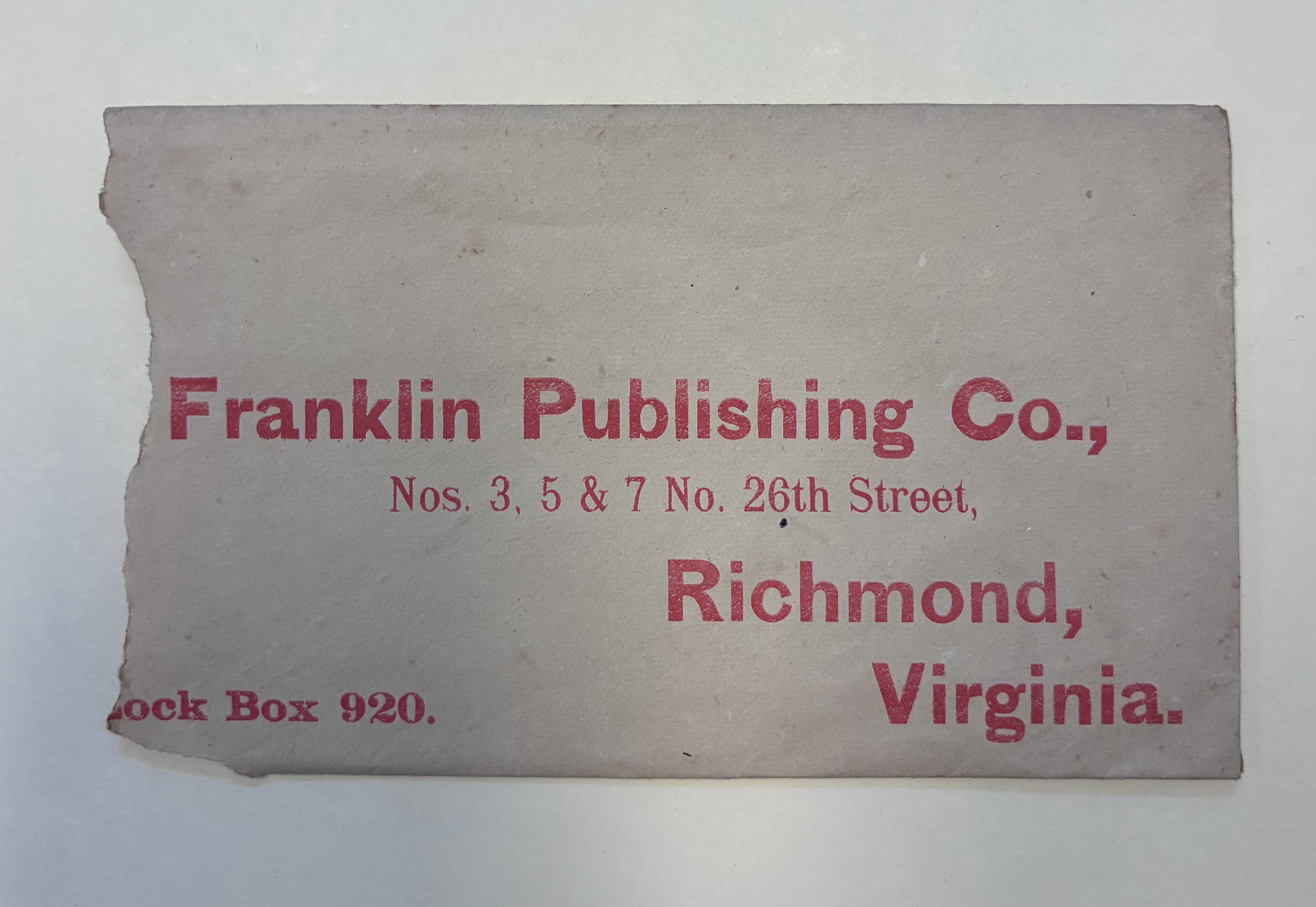 Part of Franklin Publishing Co., Envelope, Richmond, Virginia