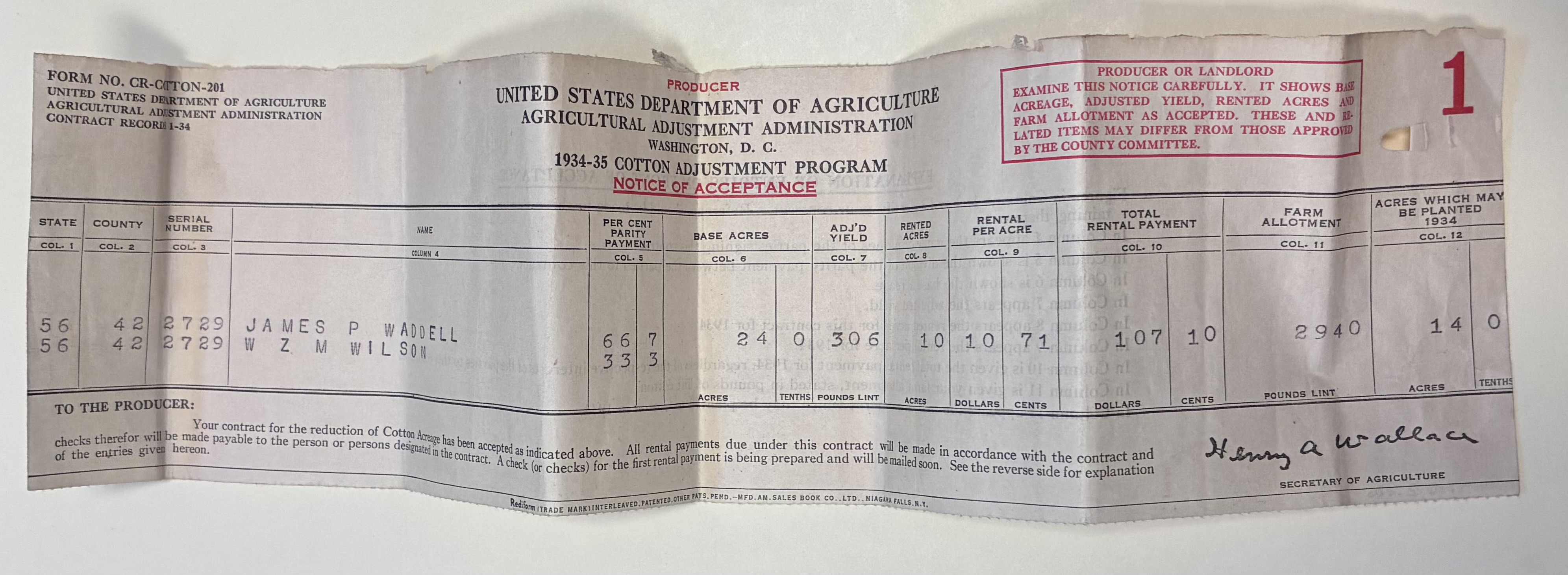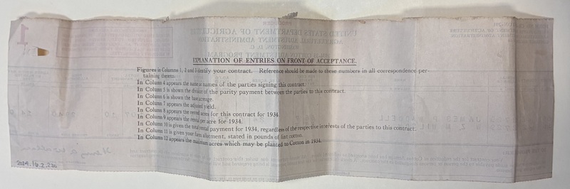 - Notice of Acceptance, United States Department of Agriculture Agricultural Adjustment Administration 1934-35 Cotton Adjustment Program, Washington, D.C.
