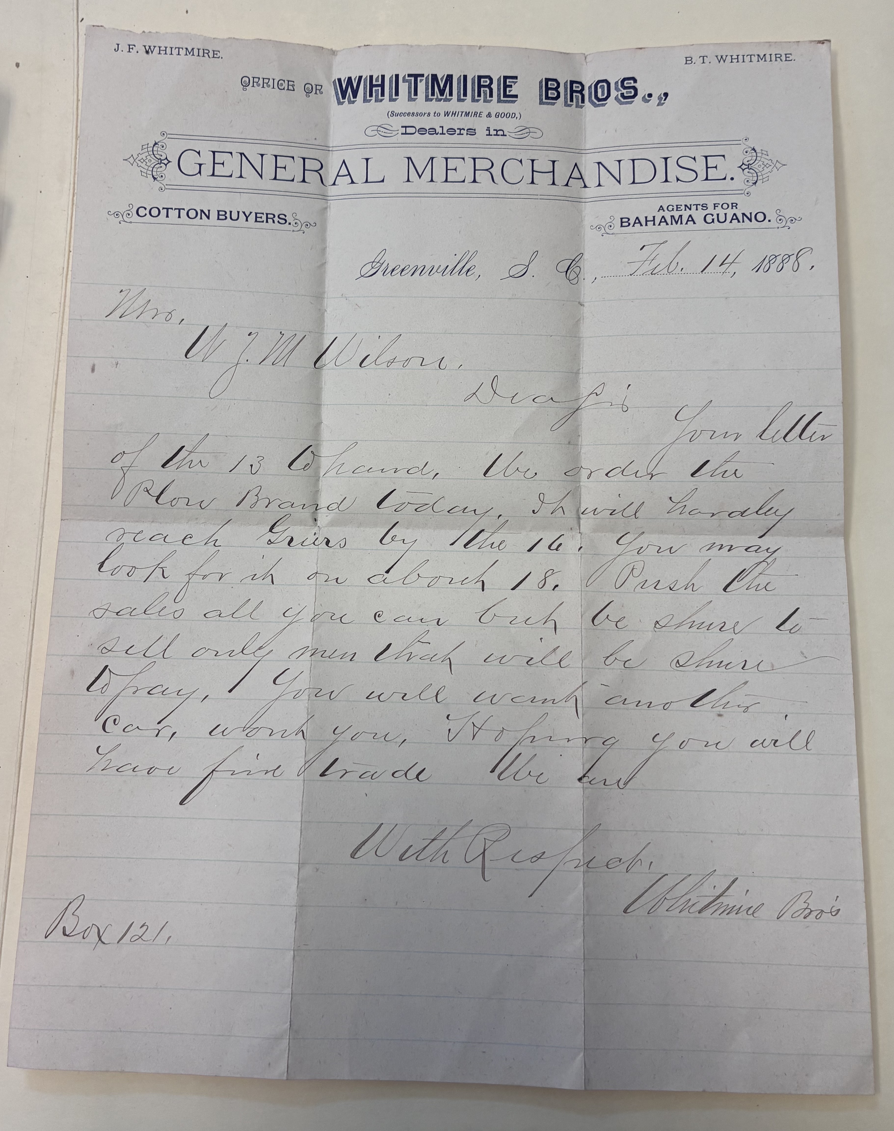 - Whitmire Bros. Letter, Greenville, S.C., February 14, 1888