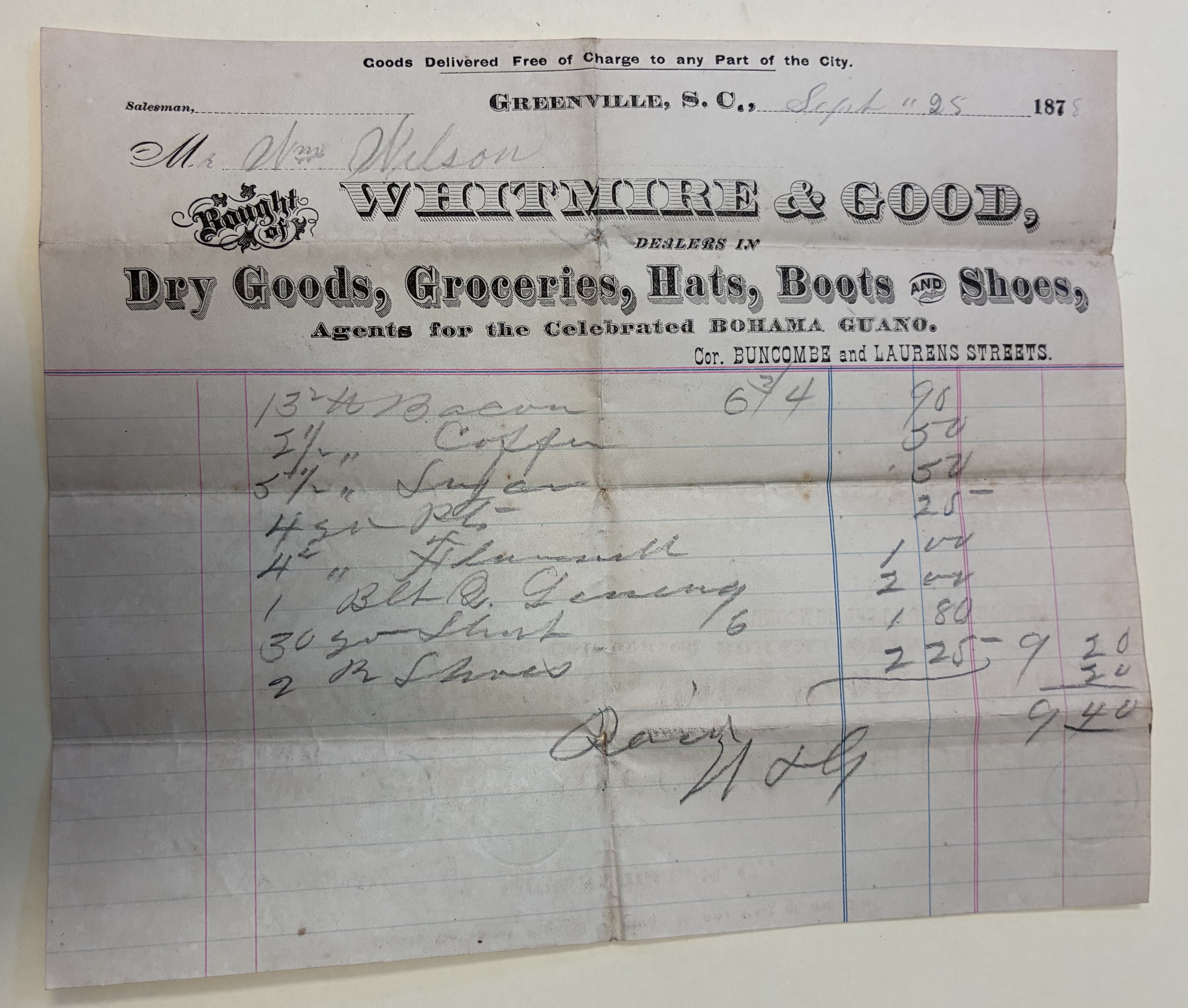 - Whitmire & Good Receipt, Greenville, S.C., September 25, 1875