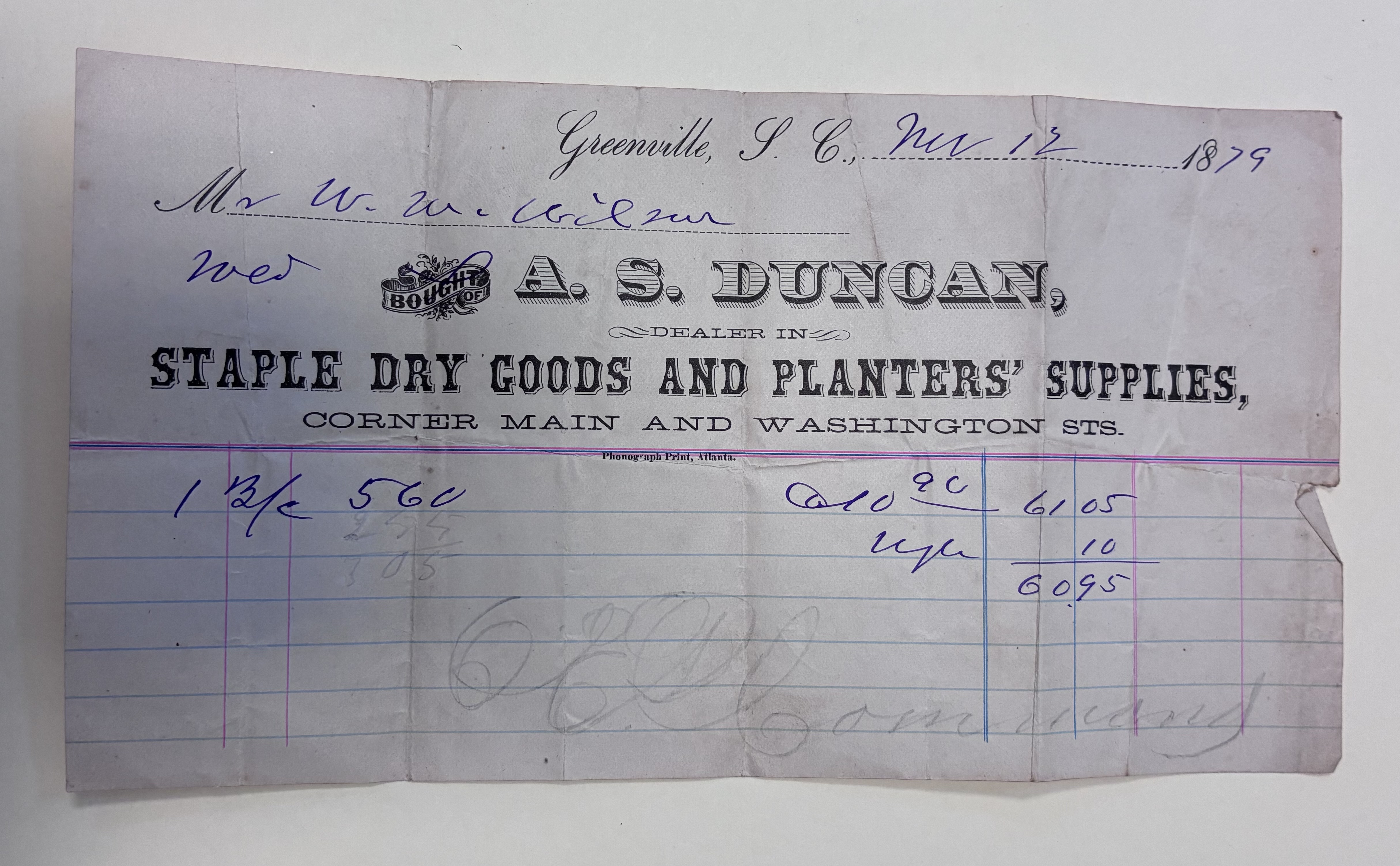 W.Z.M. Wilson sold a bale of cotton to A.S. Duncan, Dealers in Staple Dry Goods and Planters' Supplies, Greenville, S.C.