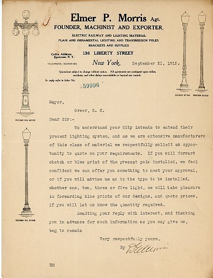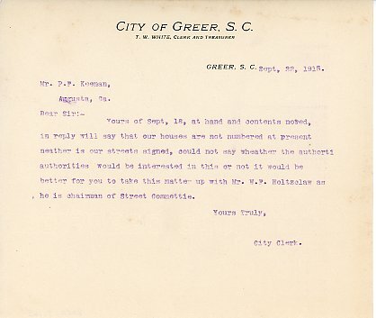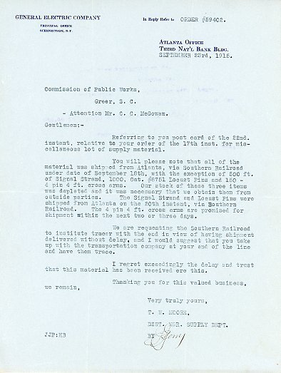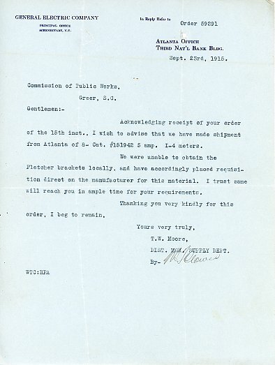Letter 11 October 1915 T. S. Inglesby to Commission of Public Works, Greer. S. C.