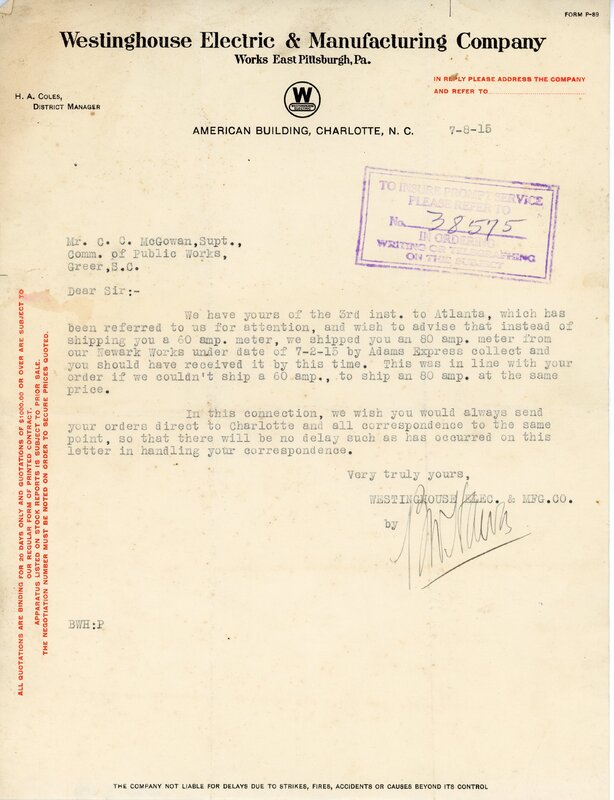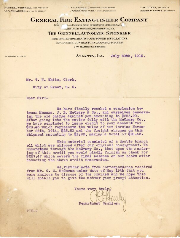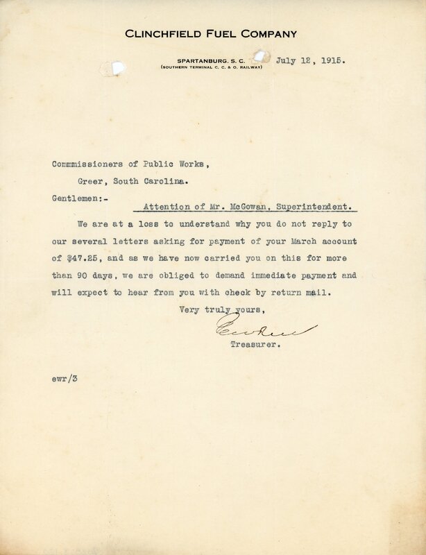 Letter 13 July 1915 Columbian Iron Works to City of Greer, Greer, S. C.