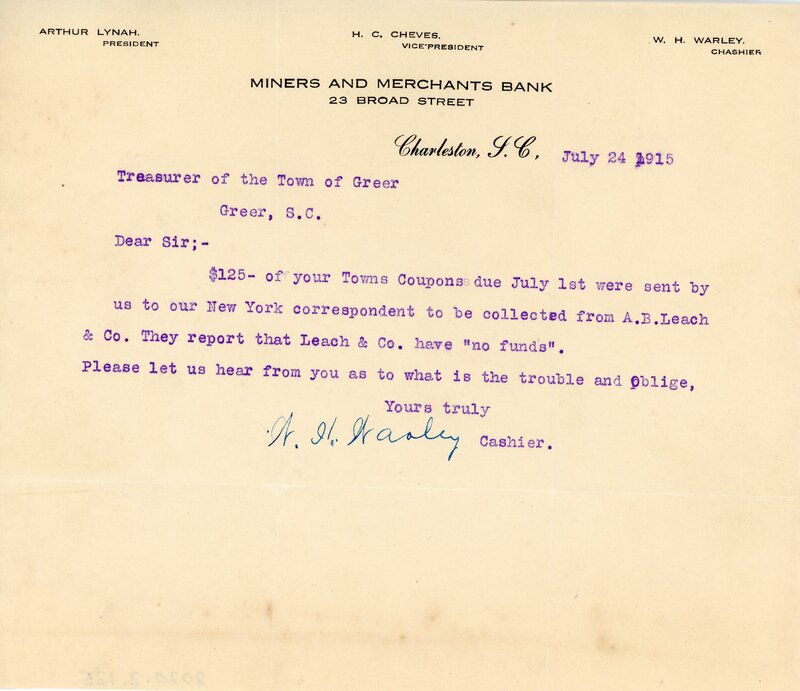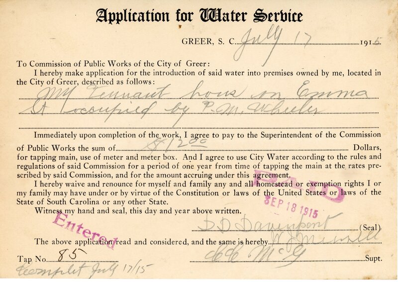 Letter 12 July 1915 E. W. R. [illegible] to Commissioners of Public Works Greer, S.C.