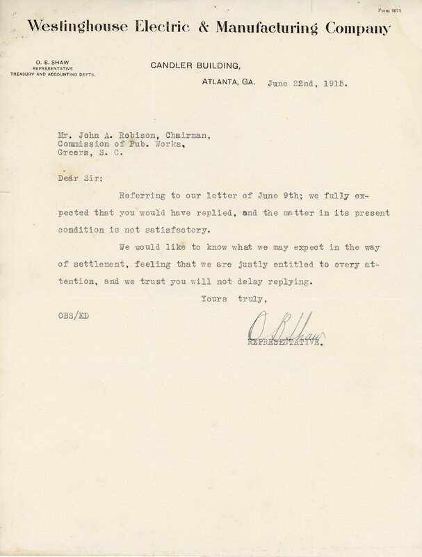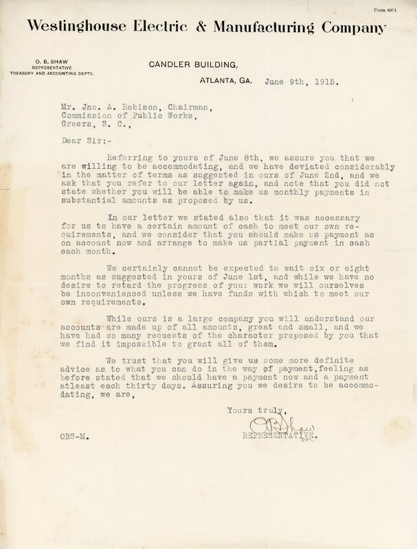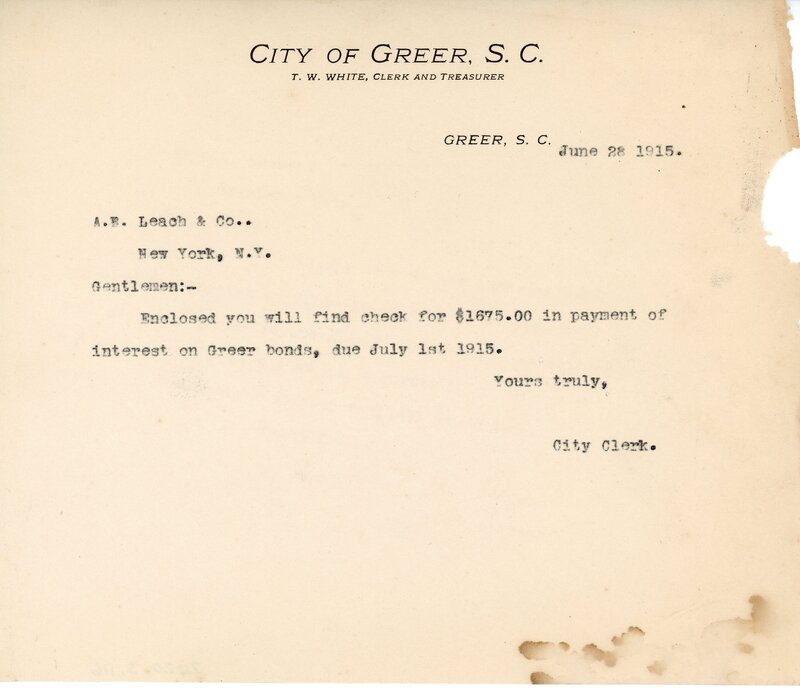 Letter 11 June 1915 W. M. Leighton to City of Greer, Greer S. C.