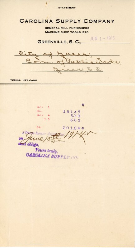 Invoice 1 Jun 1915 Carolina Supply Co. to City of Greer Commission of Public Works Greer, S. C.