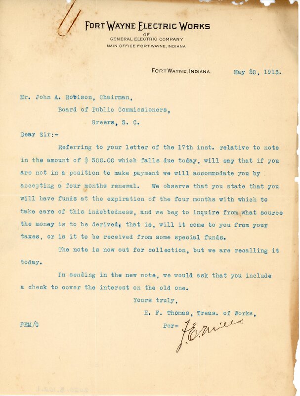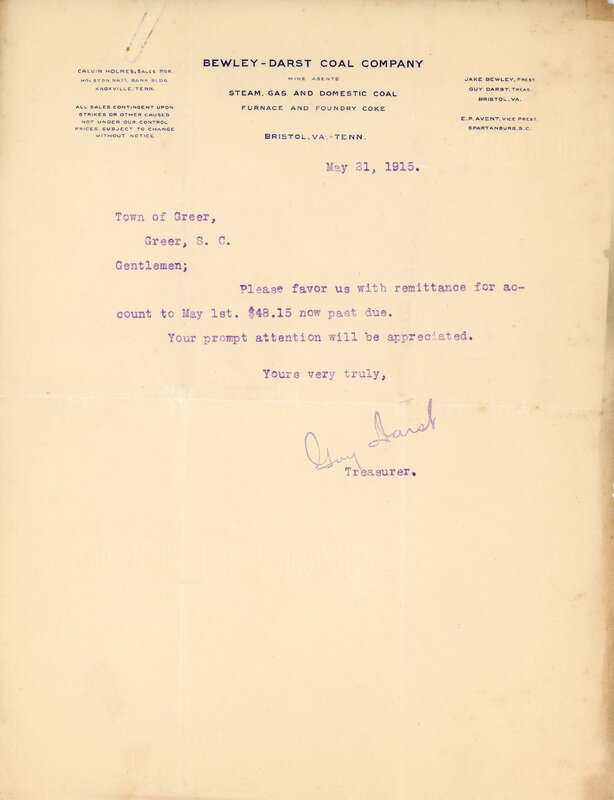 Letter 21 May 1915 G. Darst to Town of Greer, Greer S. C.