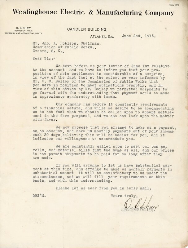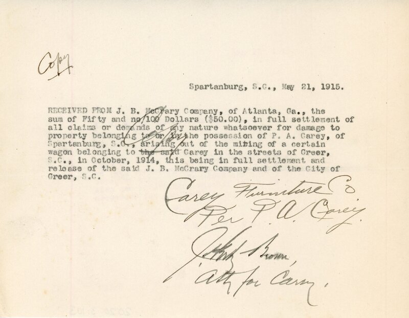 Copy of Settlement 21 May 1915 J. B. McCrary Co per P. A. Carey to City of Greer, Greer S.C.