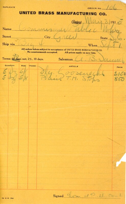 Invoice 31 May 1915 United Brass Manufacturing Co. to Commission of Public Works Greer, S. C.
