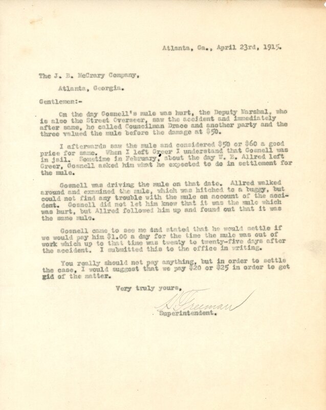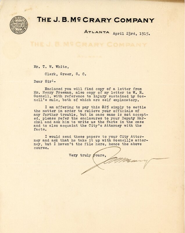 Letter 23 April 1915 H. Freeman to J. B. McCrary Co.
