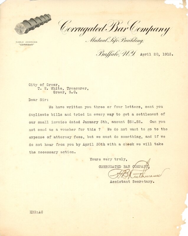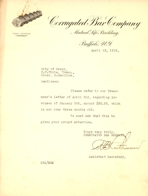 Promissory Note 1 May 1915 City of Greer to Carolina Supply Co.