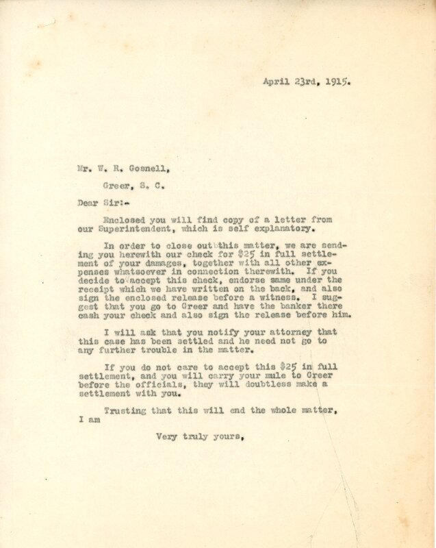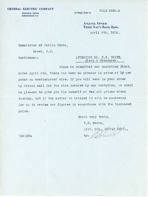 Letter 2 June 1915 W. M. Leighton to City of Greer