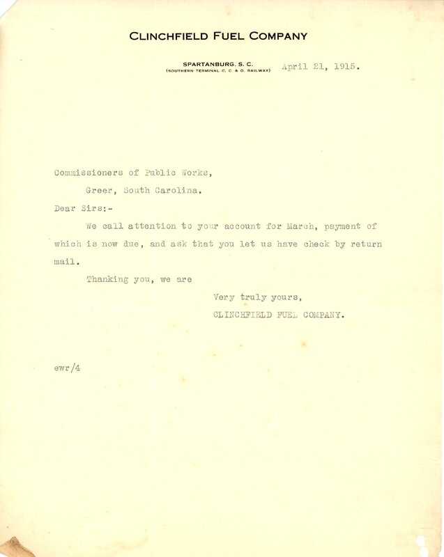 Receipt 1 May 1915 Bewley-Darst Coal Co. to Town of Greer Greer, SC