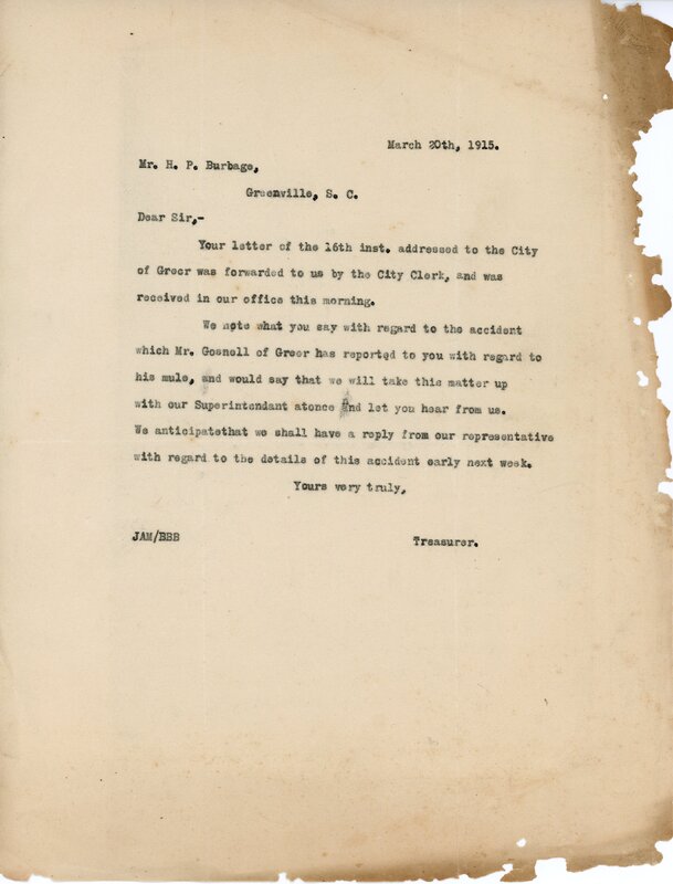 Letter 2 April 1915 J. L. Mauldin to Municipal El Lt. Pt. Greer