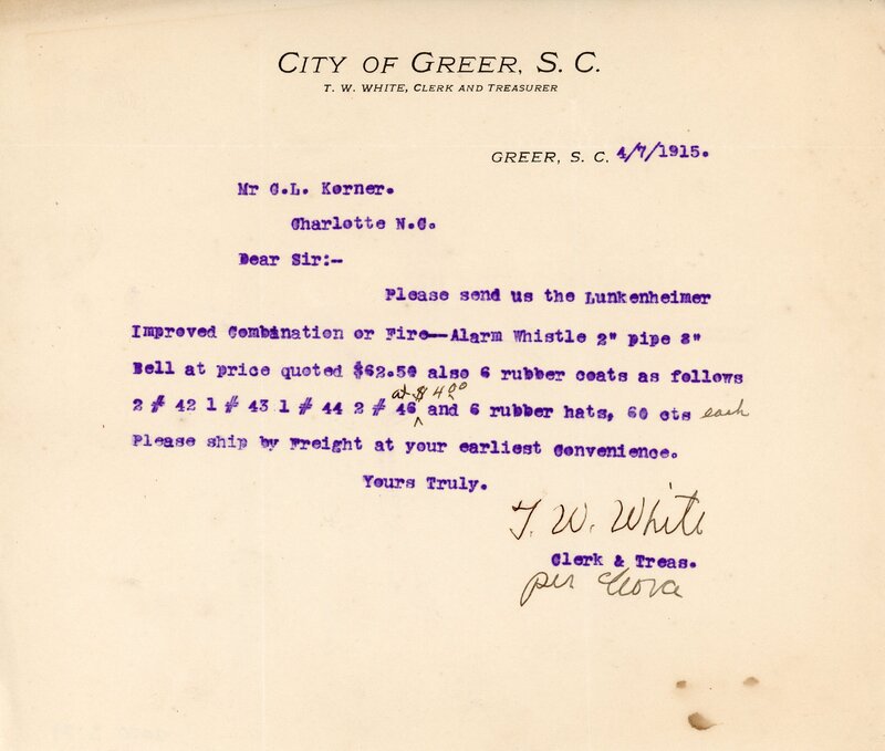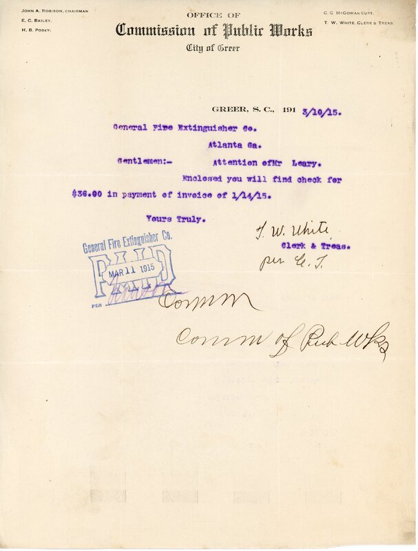 Letter 10 March 1915 T. W. White to General Fire Extinguisher Co.