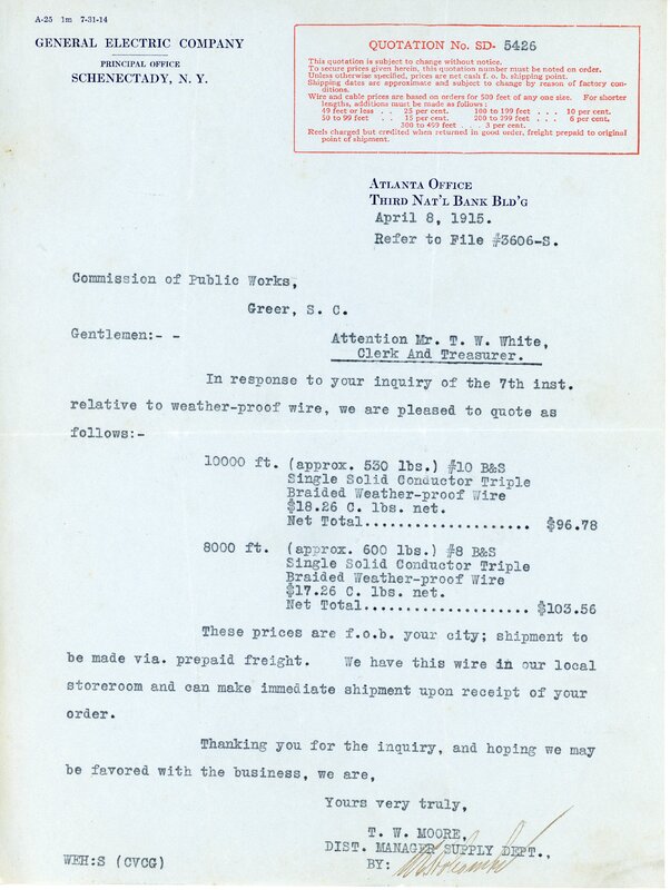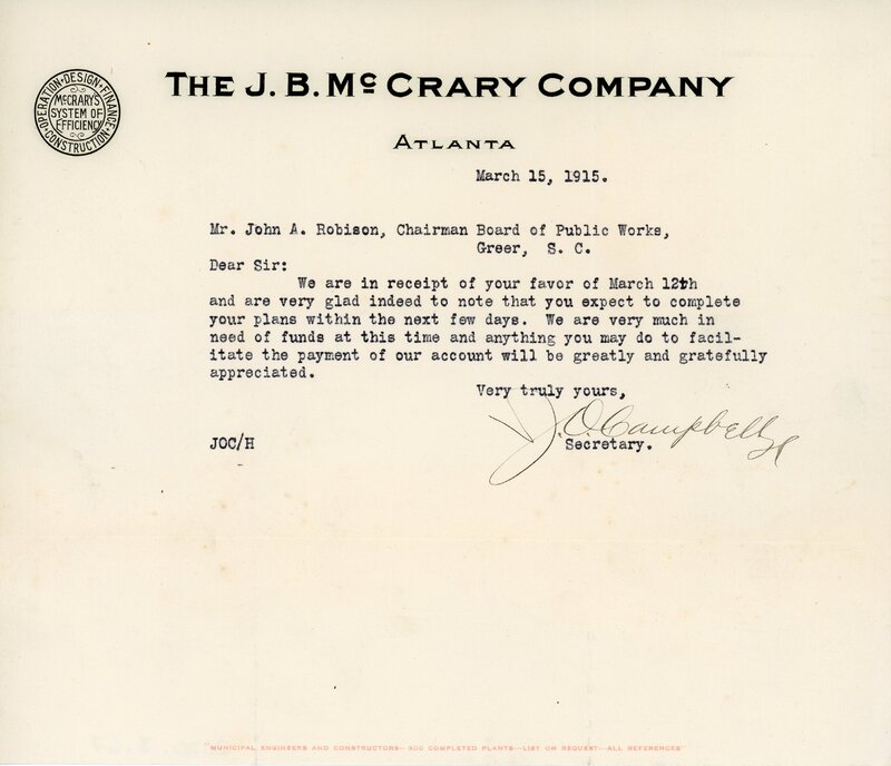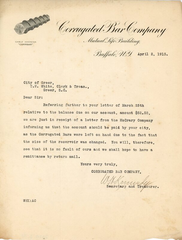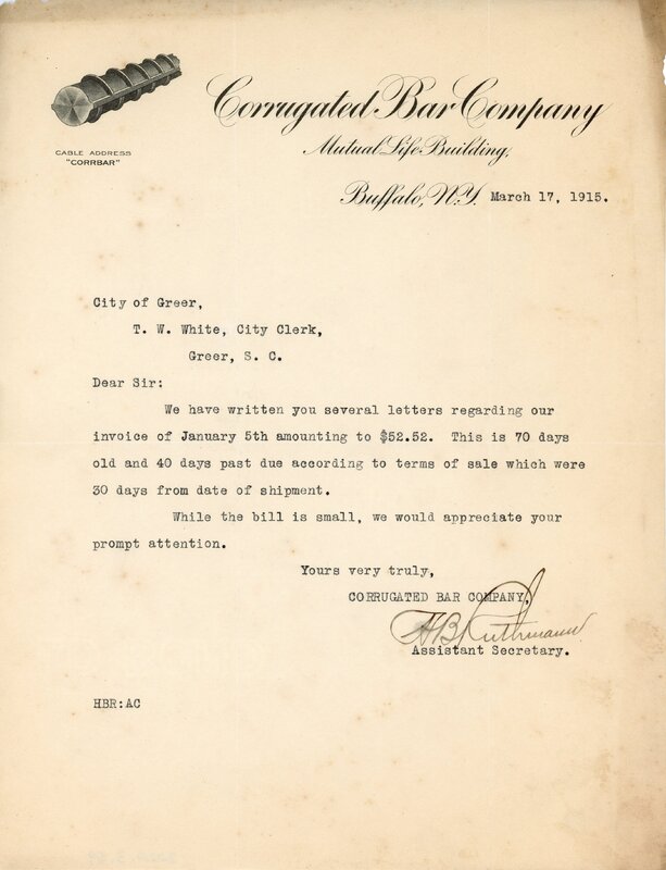 Past Due Invoice 1 April 1915 Crane Co. to City of Greer