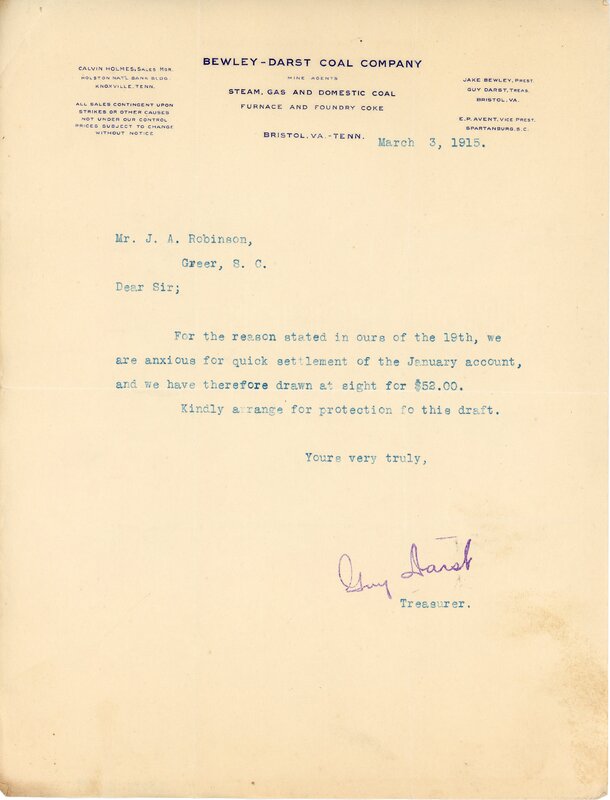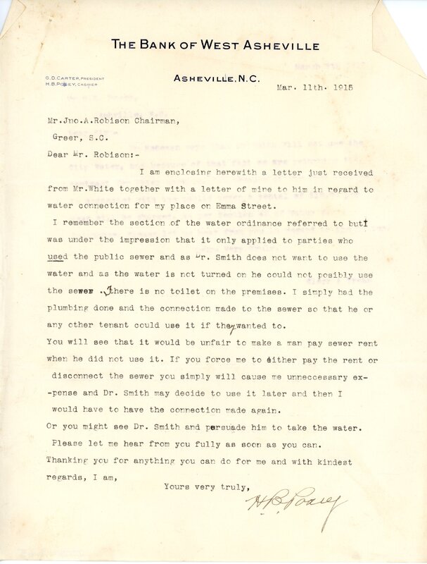 Letter 11 March 1915 H. B. Posey to J. A. Robinson