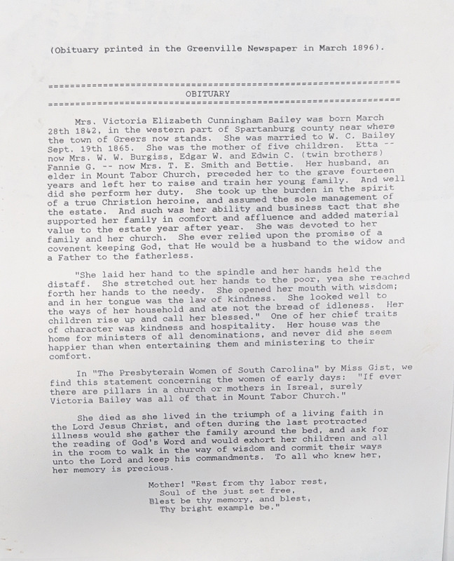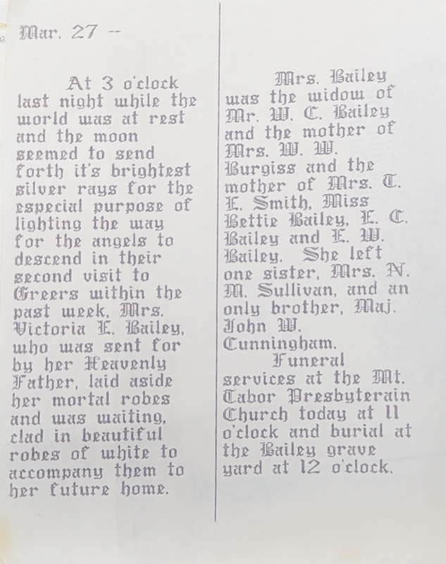 Titled: "In Memoriam," "The Late Mr. WM. C. Bailey," "Death of Mr. W.C. Bailey, of Greer's." and two untitled, identical articles, one the original copy and the other is a photocopy.
