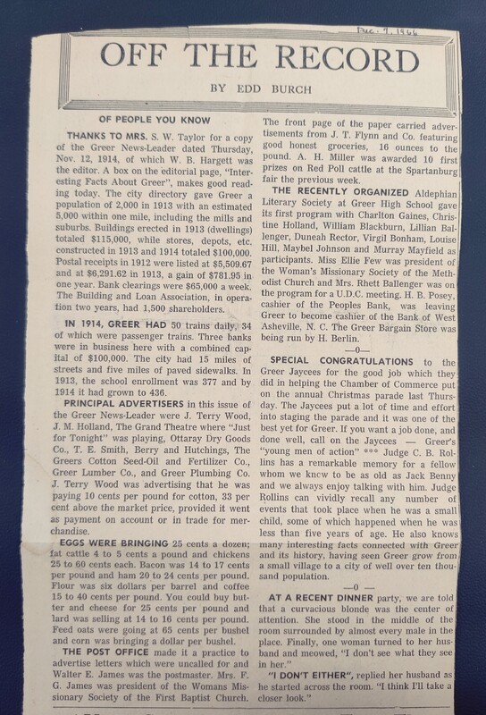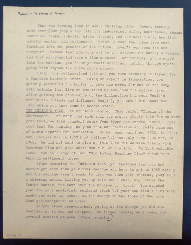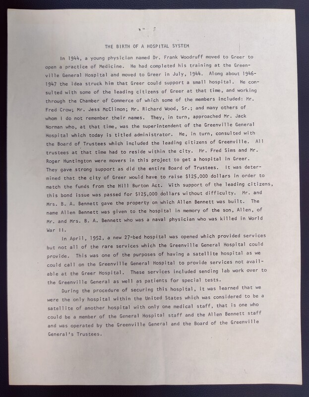 Explanation of history that led to the construction of a hospital in Greer. Authored by Dr. Lewis M. Davis. The accuracy of this document cannot be guaranteed.