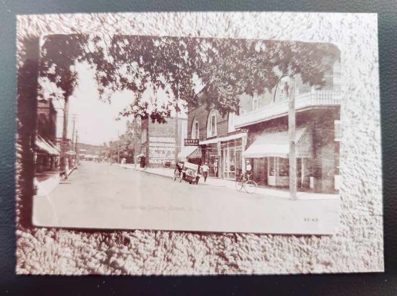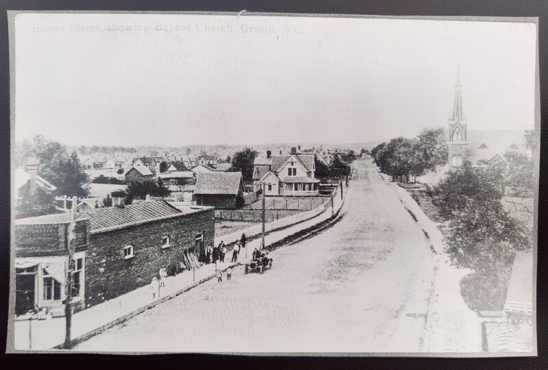 Photograph of Emma Street, Greer postcard. Now West Poinsett, from the corner of West Poinsett and Main Street. To the left is Ballenger's store, where the city police and court building now stands. First Baptist Church is on the right; it would soon outgrow this building and construct the current building about where the white house stands.