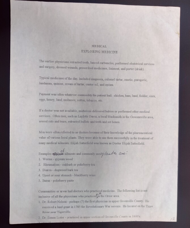 An anonymously authored history of medical practitioners in the Greater Greenville area which was most likely written around the time of the construction of the Allen Bennett hospital. The accuracy of this document cannot be guaranteed.
