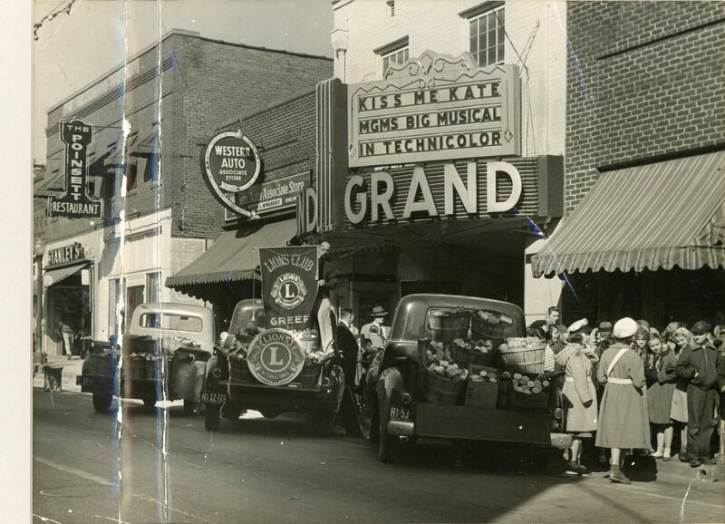 Photocopy, Black and White, Features numerous businesses (B. A. Bennett, Grand Theatre, Ponder's Ice Cream, Ford Mercury, Segee Hotel Cafe, Western Auto Associate Store), Trade Street Sqaure