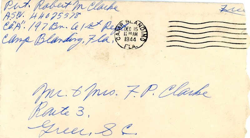 Damage envelope from Camp Blanding Fla Dec 11 1944 11:30 AM (Stamp).
