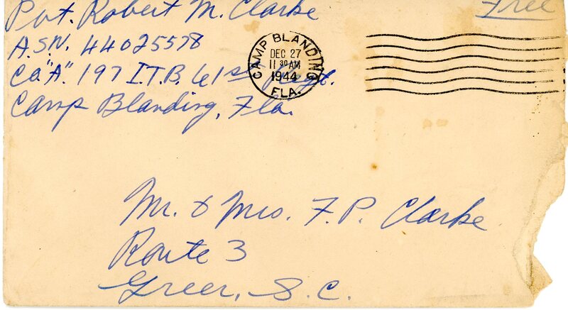 Damaged envelope from Camp Blanding FLA. NOV 20 5 PM 1944 (Stamp).