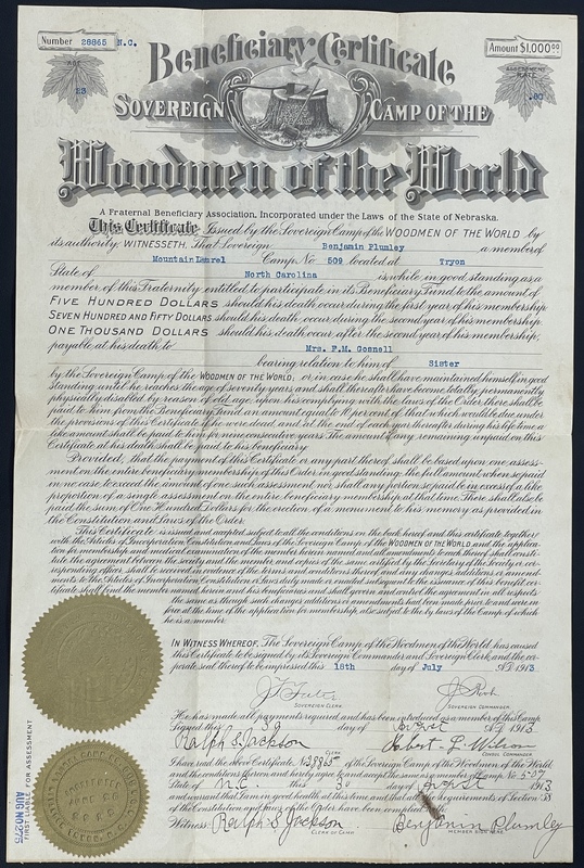 Clerk's Official Receipt from Woodmen of the World. Date 2/22 1919. Received of Benj. Plumly For Assess. No. 1919 or Install. No. 1 to 12 1919