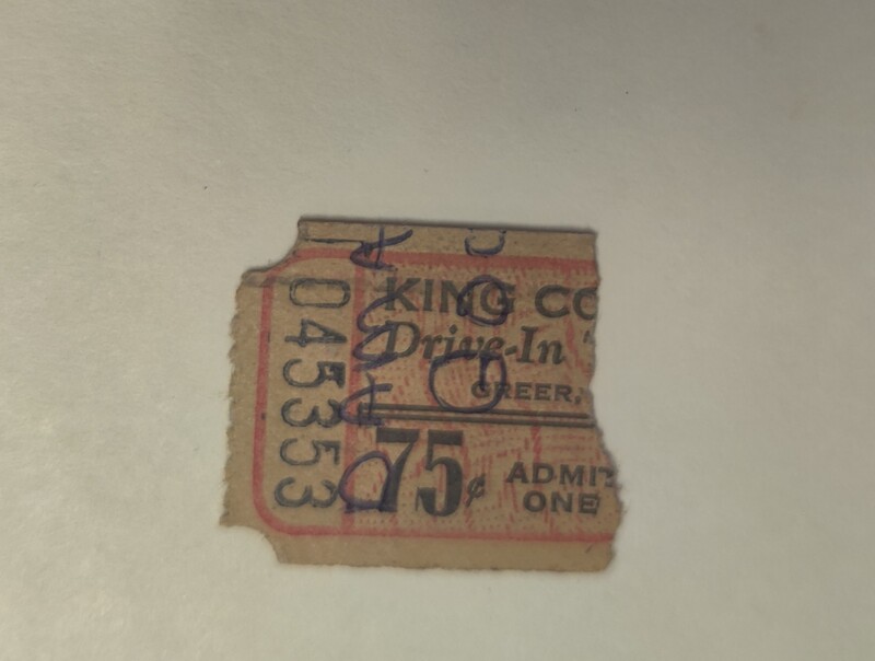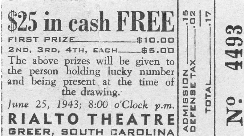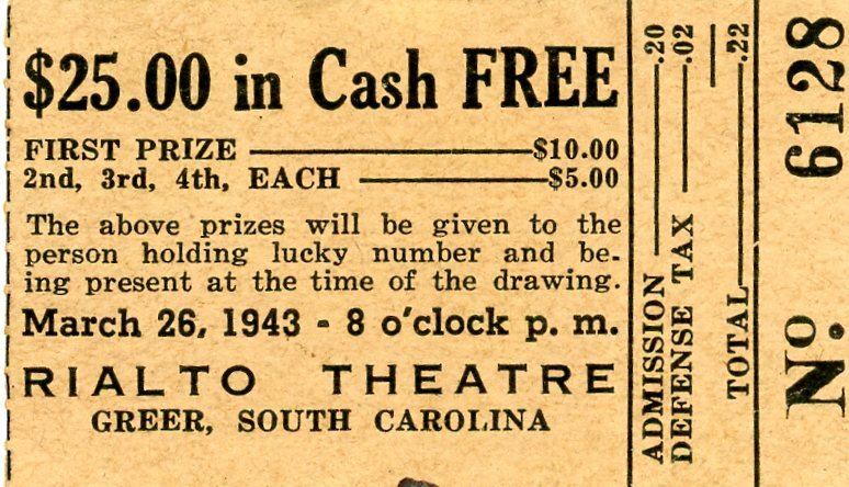 Ticket stub for the Rialto Theatre in Greer, South Carolina. The ticket is hand dated April 10, 1943. The stub commemorates a date between Macilda Oliver and Homer Turner.
