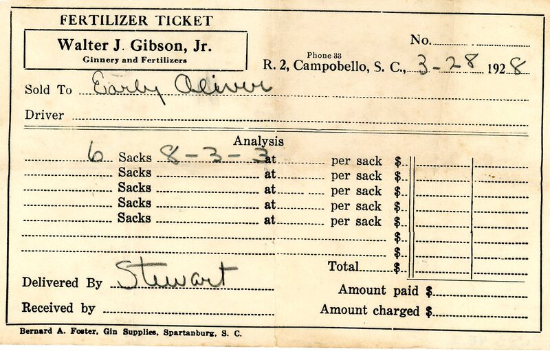 Fertilizer ticket for Walter J. Gibson, Jr. Ginnery and Fertilizers. This fertilizer ticket was for Early Oliver, Macilda (Oliver) Turner's father. The Oliver family were sharecroppers near Liberty Methodist Church.