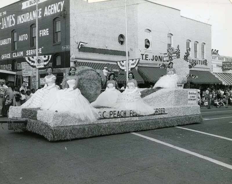 Verne Smith offers Peach Queen Martha Brannon a peach, observed by S. C. Farm Bureau Queen Adelaide Dennis and Bennie E. Gramling. This photo appears in a Greenville News article about the Peach Festival on June 12, 1958. Photographed by James G. Wilson