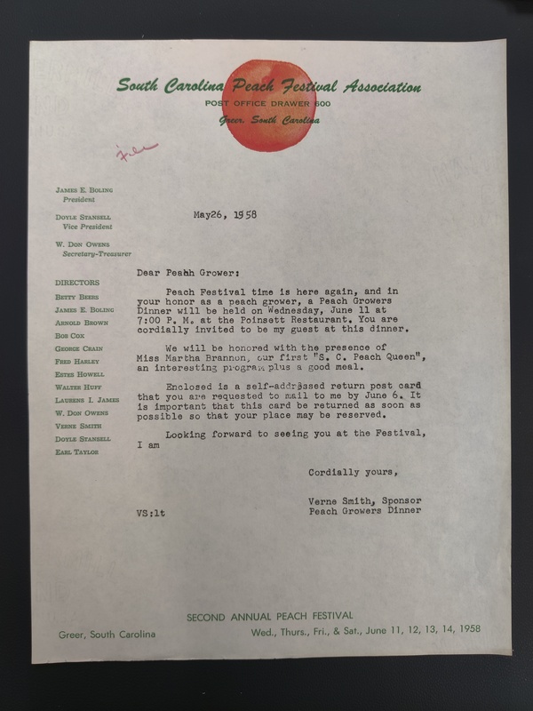 Letter from Troy Cribbs to J. E. Boling of the Greer Chamber of Commerce explaining the history of the peach industry in the Piedmont region of South Carolina (2 sheets)